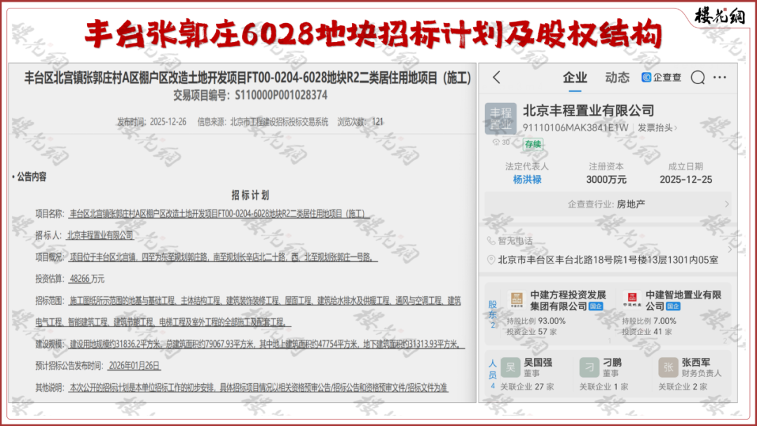 12月26日,北京丰程置业有限公司(简称“丰程置业”)发布了三个招标计划,包含6028地块的监理、设计和施工,投资估算4.83亿元。