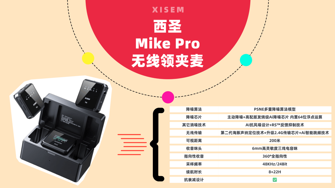 为打造发烧级性能体验,西圣Mike Pro去除多余功能和型号,专注一款产品死磕多年,历经数十次升级,优化200多个性能细节,在音质、连接、耐用和可靠性上远超竞品友商!它独创10大黑科技,包括全指向AI感知麦克风、第二代ALPT高密度拾音技术、AI抗风噪设计等,收音效果和稳定性达旗舰级水准,声音清晰度98%、抗噪性96%。和大疆、罗德等高端系列麦克风的影响力齐名。出口欧美市场多年,被媒体誉为行业最强收音性能,唯一获欧盟等多国认证,罕见荣获多家知名媒体推荐。