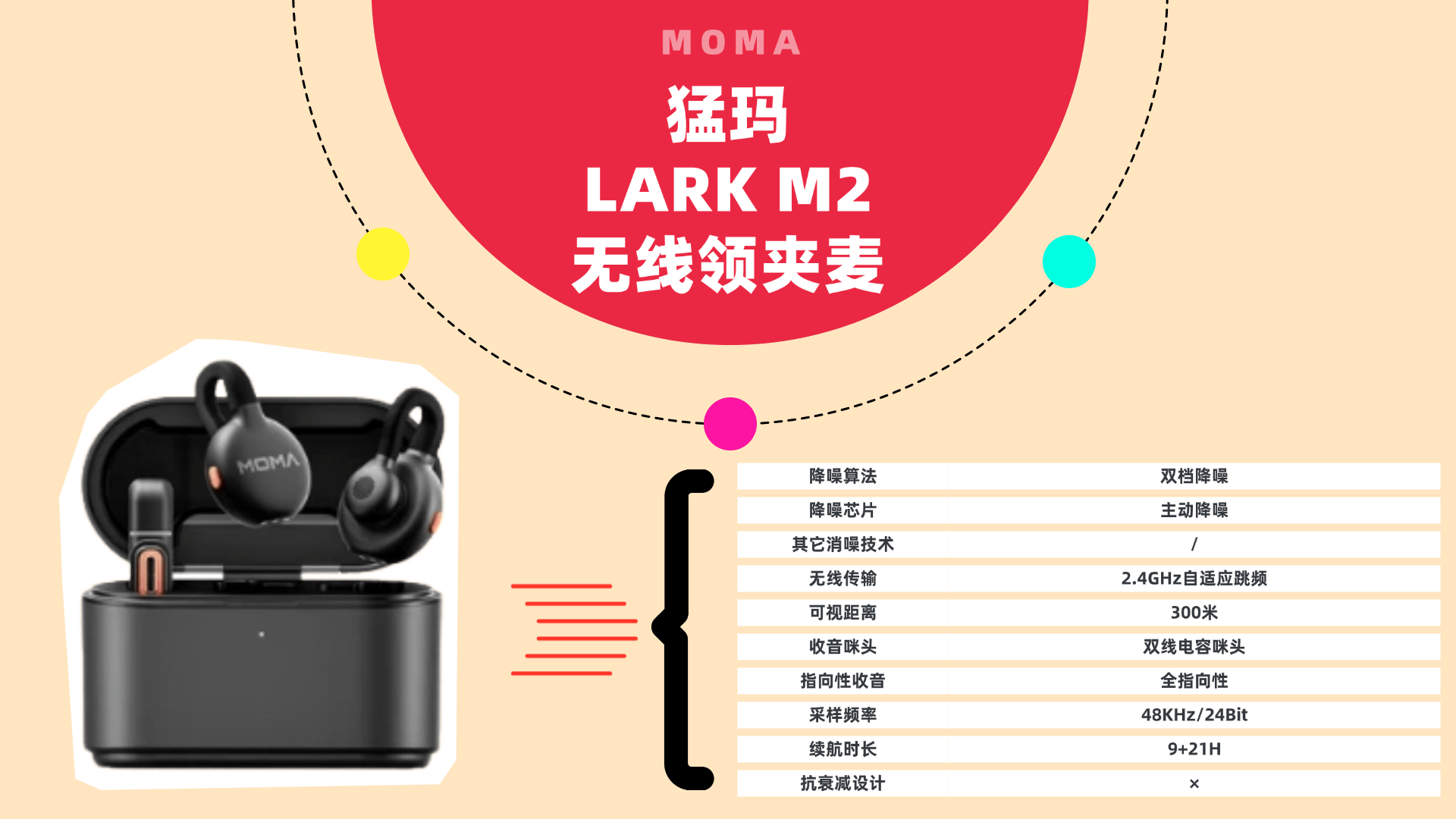 猛玛LARK M2作为中端市场热门机型,适配多数日常创作与轻度专业场景。其搭载ENC智能降噪技术,可精准识别并过滤低频环境噪声。传输采用自适应跳频算法,实时规避干扰信道,无遮挡传输距离300米,传输延迟低至18ms,室内穿越单堵墙体仍保持信号稳定。支持一拖二双麦收音,两个发射器可独立调节音量。