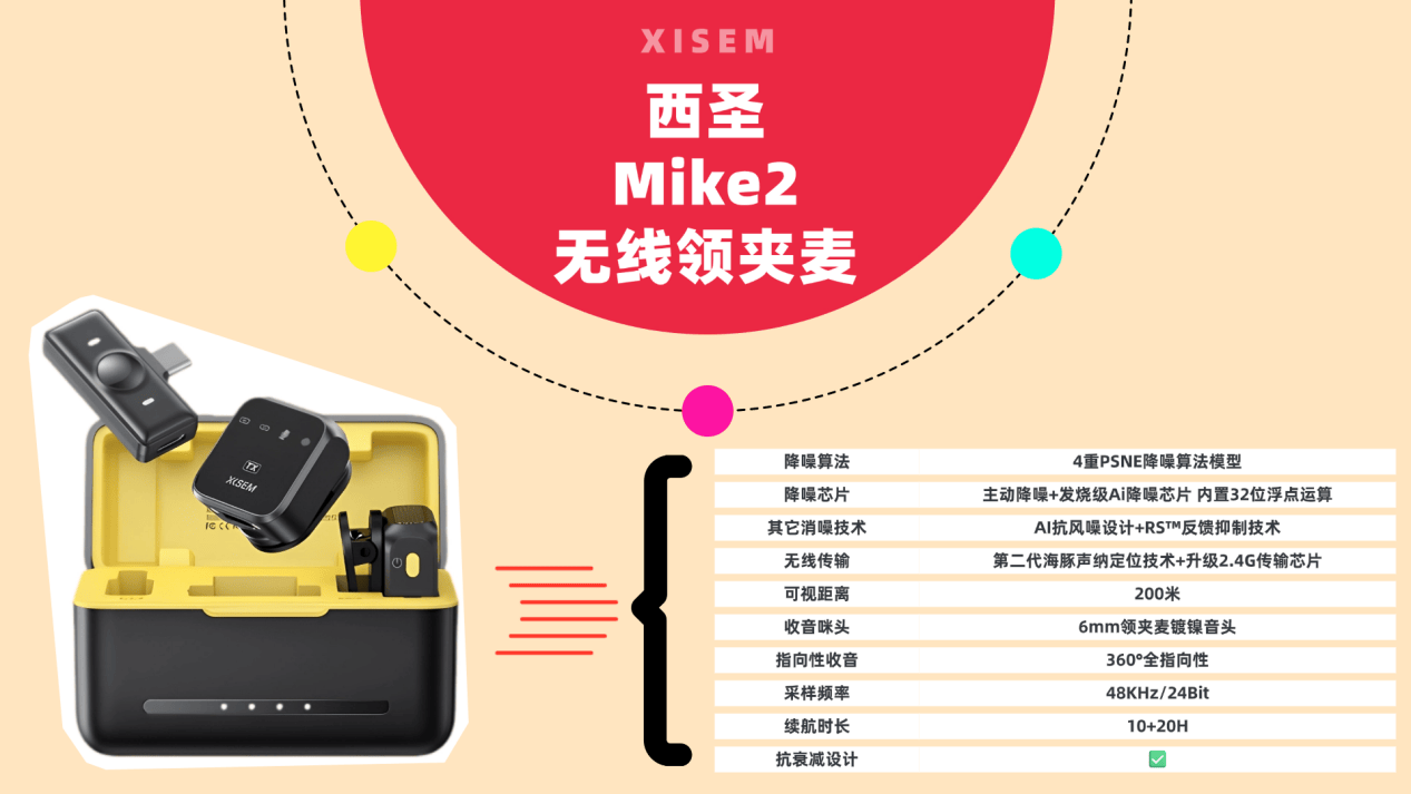 西圣Mike2麦克风几乎不做广告,全靠口碑和品质传播推广。它不搞多余的大众化功能,纯粹专注于发烧级音质,把省下的成本全部投入到研发中,用料和技术均达到行业顶尖水准!比如采用进口定制的6mm镀镍音头、32位浮点数DSP芯片、4重PSNE降噪算法和第二代ALPT高密度拾音技术,实现98%的声音清晰度和96%的抗噪性。同时,西圣还独创了AI抗风噪技术、磁吸迷你设计和200米稳定传输技术,解决了户外收音干扰、佩戴不稳和信号延迟等问题。
