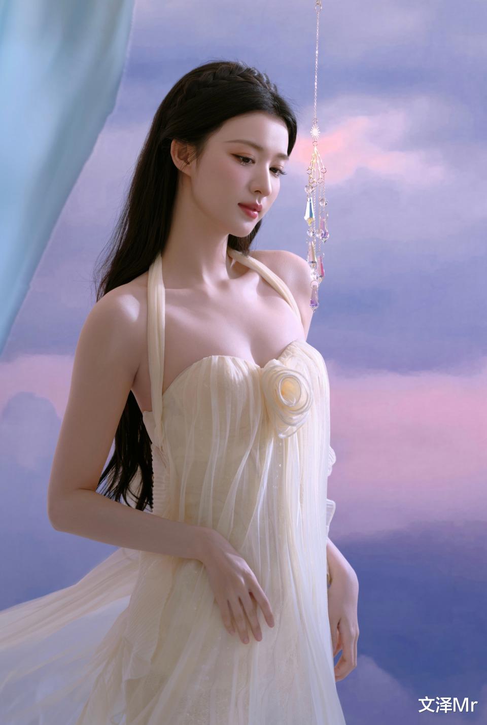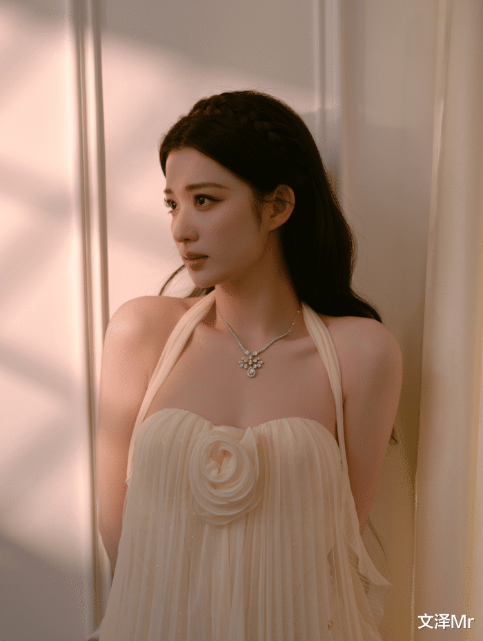 早年被说 “小刘亦菲”,如今她用这条裙告诉大家:她的美是 “流动的”—— 裙摆扬起的弧度,刚好露出她练过仪态的腰臀,挂脖带勒出的肩线,是独属于她的 “锐角美”。