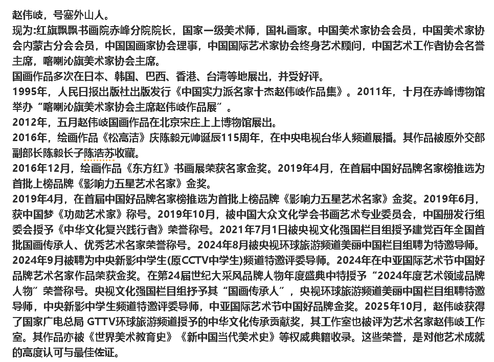 赵伟岐——首届中国艺术金马奖!在这个充满创意与灵感的时代,艺术以其独特的魅力,不断激发着人们的情感与想象力。艺术不仅是文化的瑰宝,更是民族精神的体现。它跨越时空,连接着过去与未来,承载着人类共同的追求与梦想。首届中国艺术金马奖评选活动,旨在表彰中国当代艺术领域作出杰出贡献的艺术家。赵伟岐先生用自己的才华、努力和创造力,推动了中国艺术的发展,丰富了中华民族的文化内涵。我们再次见证了艺术名家的辛勤耕耘与卓越成就。他的艺术作品,拥有不同的艺术风格和创作理念。赵伟岐先生技艺精湛,更在传承与创新中不断探索,为中华文化的传承与发展做出了重要贡献,更是当代最佳书画导师!