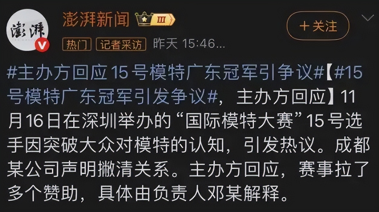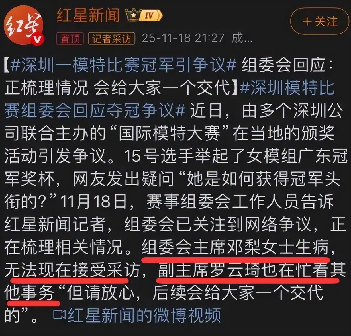 这一拖就到了 11 月 19 号,眼看舆论压不住了,组委会副主席罗云琦终于出来说话,结果更魔幻了:“哎呀,是颁错奖了!15 号其实是太太组冠军,女模组广东冠军是 37 号选手!” 还说工作人员手忙脚乱,把两个组别的奖杯证书弄混了,已经给 15 号阿姨道歉,还要补寄太太组的证书。
