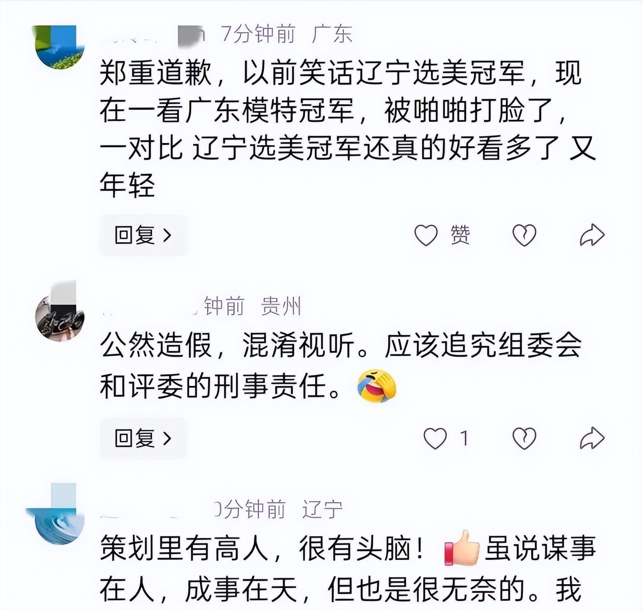 更讽刺的是,之前辽宁选美冠军也被吐槽过形象不符合预期,可跟广东这场比起来,人家至少有清晰的获奖名单和评委信息。现在广东这场比赛,连 “谁是冠军” 都成了谜,一会儿是 15 号,一会儿是 37 号,一会儿又冒出来个 “艾玛尔”,网友调侃:“要不干脆搞个‘找冠军’大赛吧,比模特比赛还热闹。”