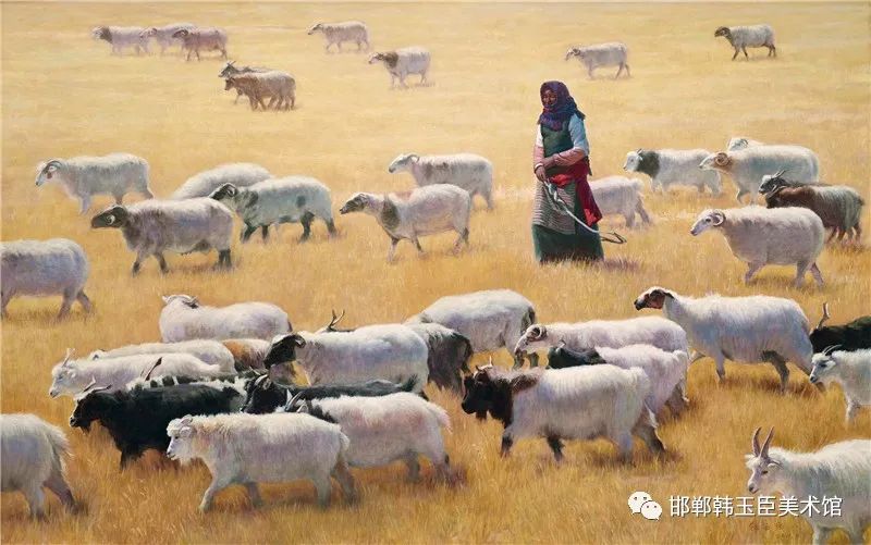 韩玉臣对西藏题材情有独钟,缘于其1972 年欣赏到了董希文的西藏油画写生、1977 年观看陈丹青 《泪水洒满丰收田》受到的震撼。自2006年起,韩玉臣先后数十次深入藏区,进帐篷、住藏家,融入藏民生活日常。在平均海拔4000米以上的西藏,氧气稀薄,日照强烈,生活条件落后,无疑会为画家采风带来重重困阻和挑战。但他坚定信念、矢志不渝,所创作的100多幅西藏题材的油画作品,生动再现了藏区天高地广、牛羊成群结队的自然风光,形象刻画了藏民大美至纯、天性质朴善良的人文特征,深刻揭示了朝拜路上一步一叩首、忘我而坚定的精神信仰,多角度全方位的展现了阳光下藏区人民的真实生活画卷。