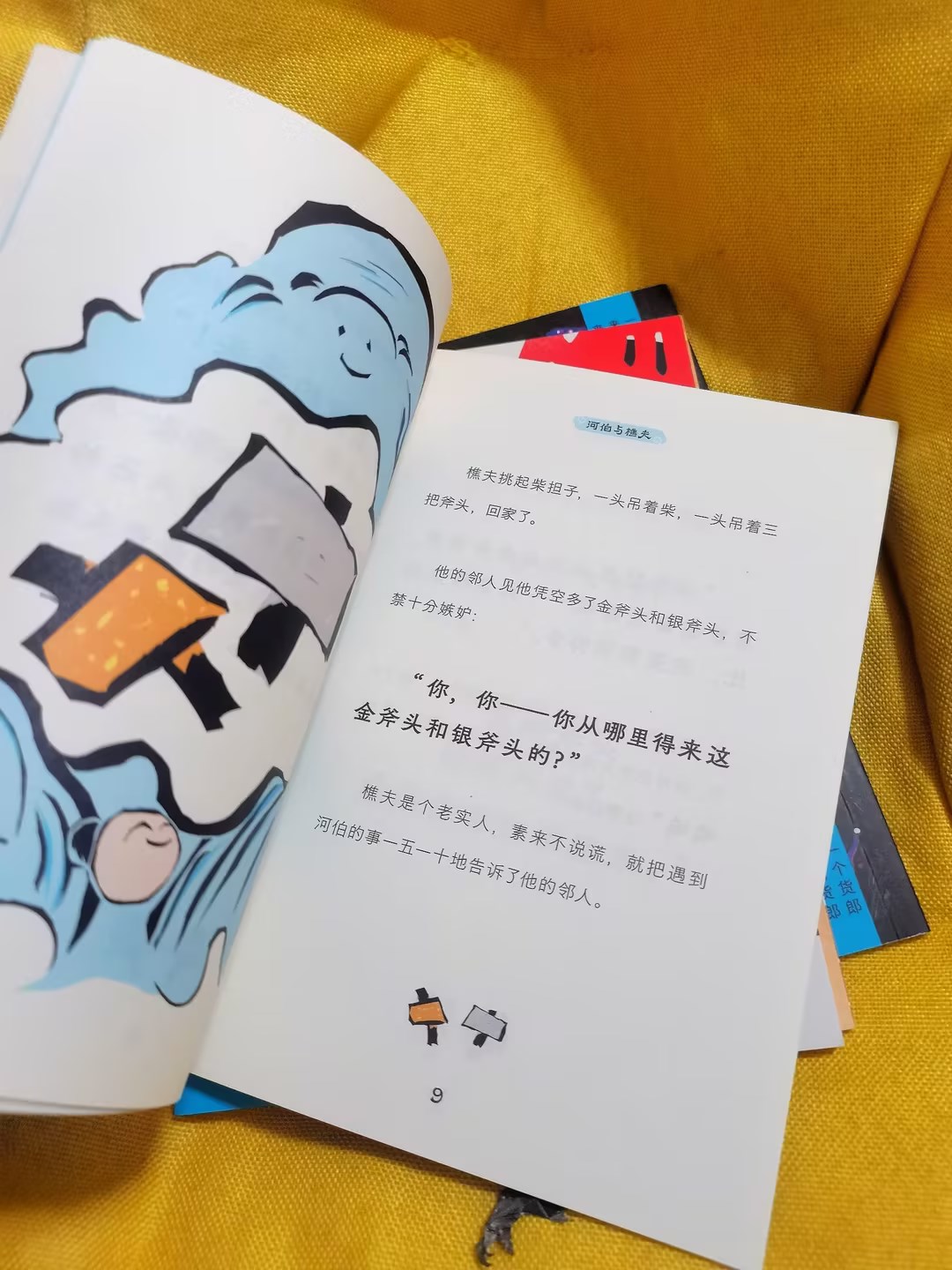 ●排版很有特色。这套书的排版特别用心。封面一个系列,左侧都一个色。每本书的页码处,都带着统一的小元素。而且是和文章内容相关的设计。例如:《杨六郎枪挑白石精》中,是两把打起来的枪。《水母娘娘》则是两个水桶。《河伯与樵夫》用的是两把斧子。《牛郎织女》则是笛子和两朵花。