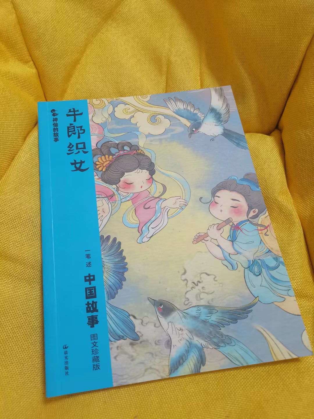 这套书,光看封面设计就很独特,不愧珍藏版!作者是一苇,她可是个讲故事的高手,她还是冰心儿童奖的作家。她用了十多年的时间,为咱们的孩子汇总成了这套中国故事集。最厉害之处是每本书都请了不同的插画师,所以总共汇集了近100位青年插画师。插画多以中国元素符号融入插画中。《牛郎织女》用了中国工笔画法风格,人物饱满,衣纹也很飘逸。
