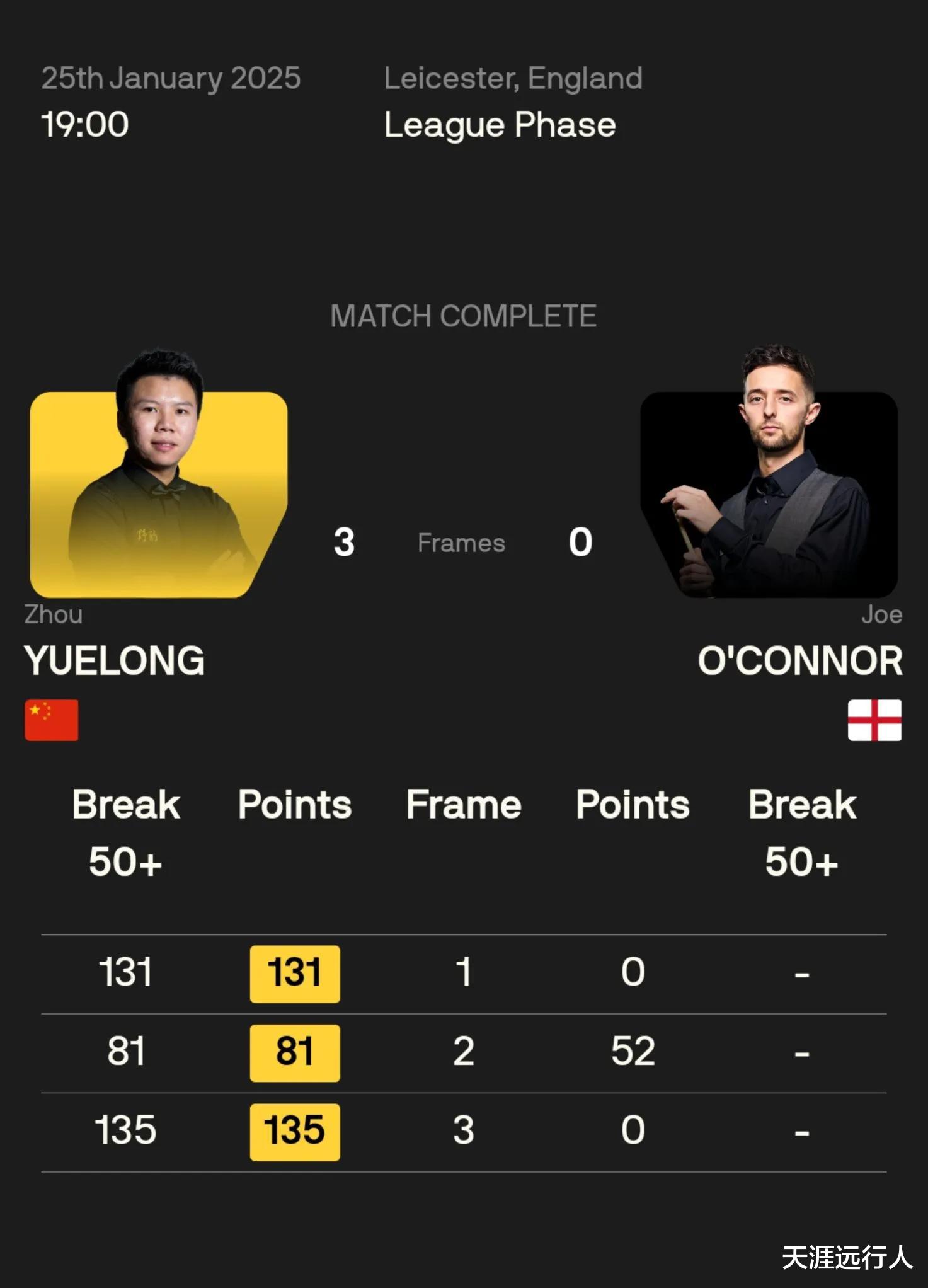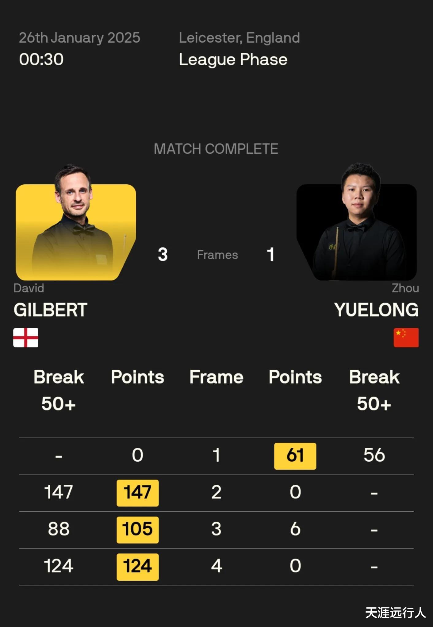 包括土豆哥的147,这个比赛日打出九杆单杆破百,土豆哥吉尔伯特打了三杆,领走500英镑的单杆最高分奖,周跃龙、肖国栋、里奇·沃顿各完成两杆单杆破百。
