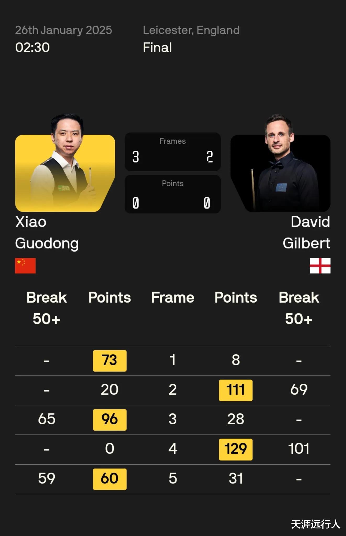 北京时间1月26日凌晨4时57分,2025 BetVictor 斯诺克冠军联赛第七小组第二比赛日,小组循环赛后半程6场和小组淘汰赛阶段3场角逐,全部决出了胜负,小组决赛肖国栋3-2力克刚刚打出一杆147满分杆的大卫·吉尔伯特,夺得组冠军,强势挺进本届冠军联赛邀请赛版最后的胜者组。