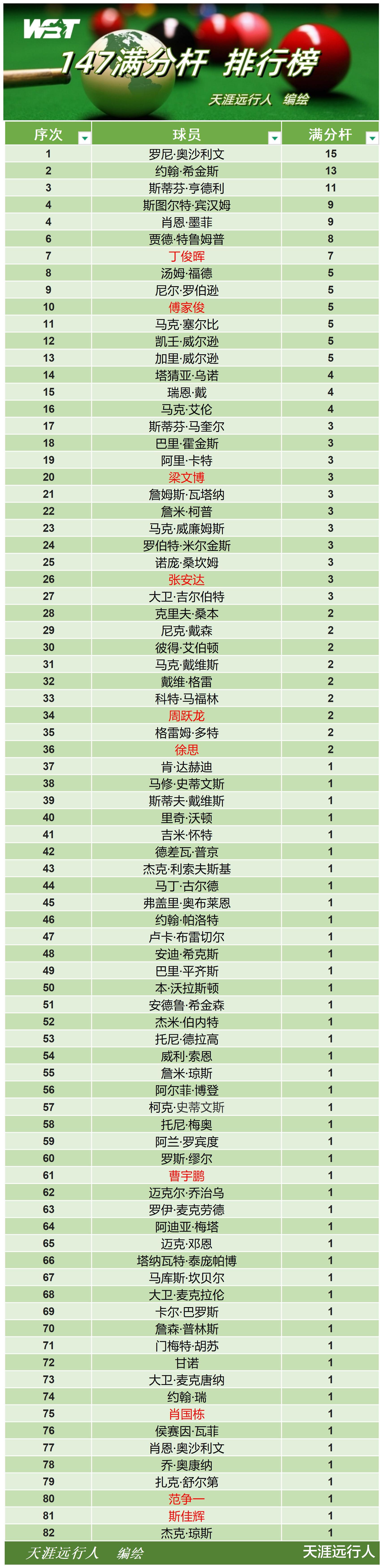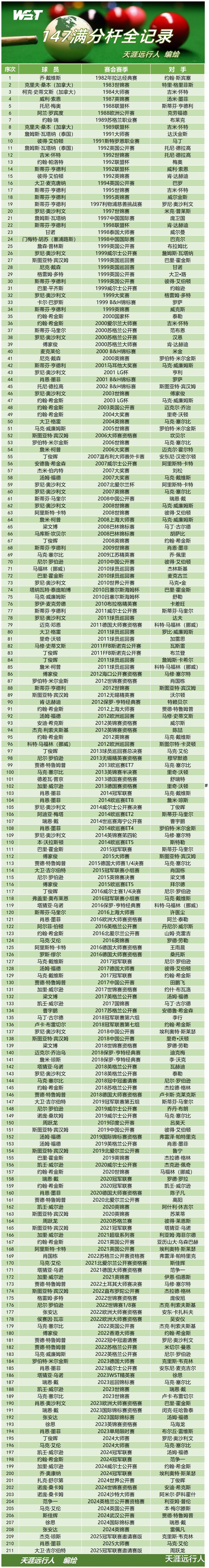大卫·吉尔伯特在对战周跃龙的第二局,高调打出一杆147满分杆,土豆哥收获个人职业生涯的第三杆147满分杆,这是2025年度的第三杆147,2024/2025赛季的第9杆满分杆,也是职业巡回赛历史官方统计的第211杆147!本届冠军联赛的第二杆。