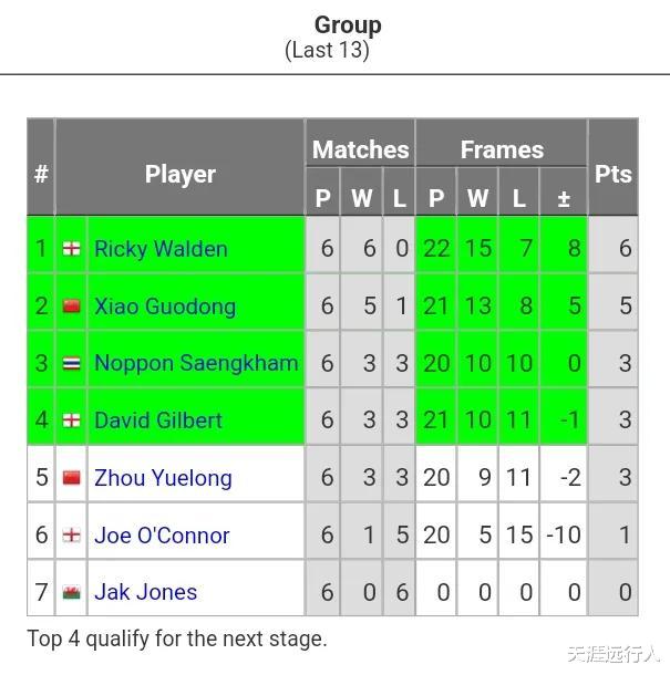 诺鹏·桑卡姆、大卫·吉尔伯特和周跃龙三人同为五战两胜三负,以胜局数、净胜局数的多寡分列第三-五位,周跃龙无缘小组淘汰赛;