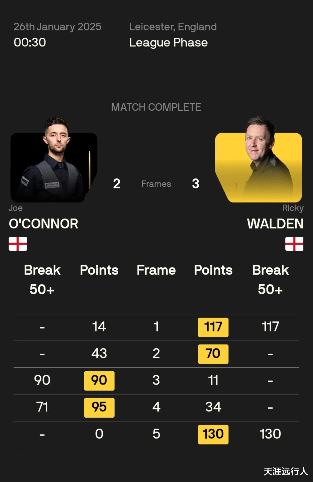 上一组循环赛六战六胜的乔·奥康纳,这一组彻底拉胯,尬取五战五负,小组垫了底。