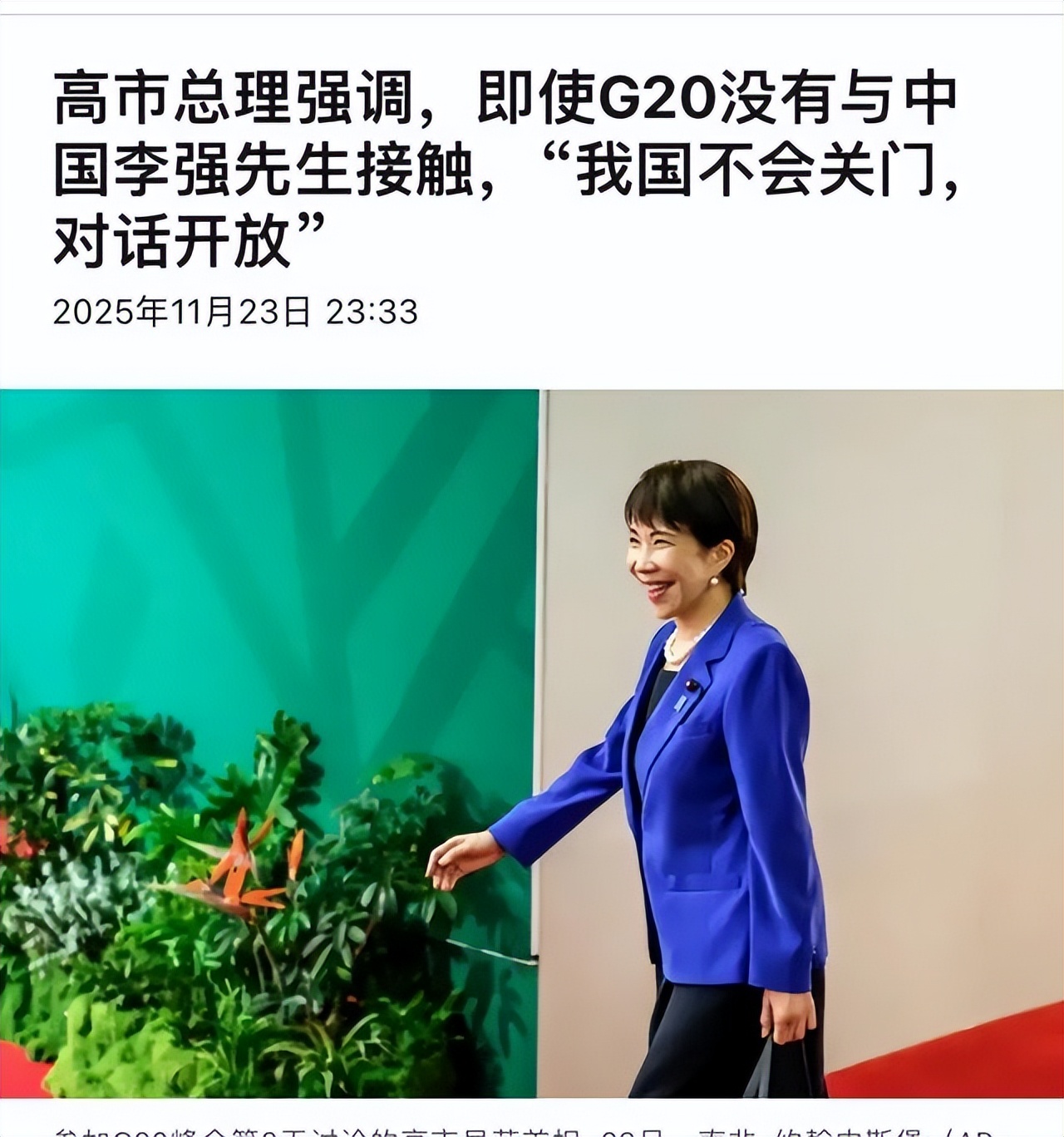 峰会闭幕后,高市早苗在记者会上承认与中国无互动,她指出,日本事先没有与中国协调会面,G20现场也没有机会与李强交谈。但她强调,日本对与中国进行对话保持开放态度,大门始终敞开。同时,她重申,日本会坚持必须主张的立场,在推进建设性稳定的中日关系时,面对悬而未决的问题,需要减少分歧并扩大互信。