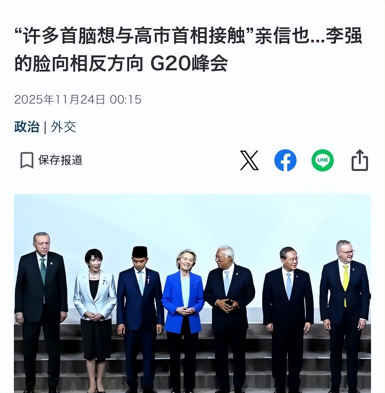 不过,高市早苗在峰会期间试图寻求与中国国务院总理李强的接触机会,却始终没有实现。中国外交部发言人在峰会前已明确表示,李强没有与高市早苗会谈的计划。日本方面原本期待在非正式场合如会议间隙或偶然相遇时进行交流,但整个G20过程中都没有达成。在大合影环节,高市早苗与李强的站位仅隔三人,但双方没有眼神交流或握手动作。