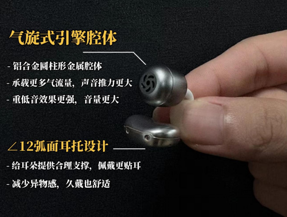 然后再说说它的戴感,它的耳挂设计挺特别,是环扣式的,跟卷轴一样卡在耳骨上,不管是什么耳型都能较好适配;这款耳机单耳6.35克,戴着很稳,但比之前试的其他几款稍重点,戴久了耳朵会有点不舒服,这点需要多加留意。