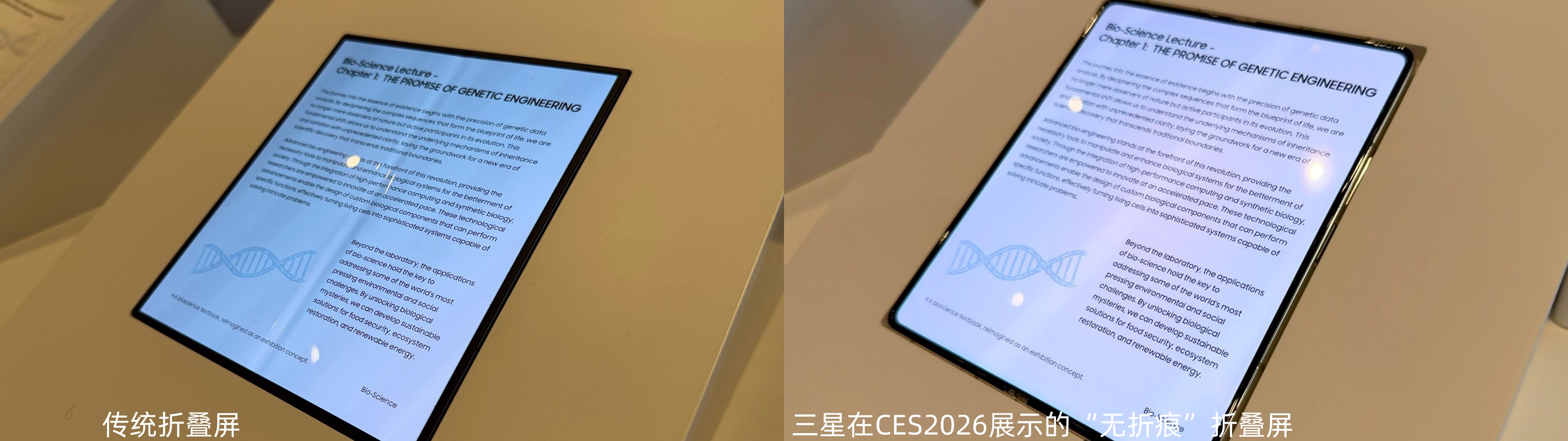 在拉斯维加斯的CES 2026上,三星亮出了一块全新的折叠屏——展开几乎看不到折痕!与旁边的传统折叠屏的差别一目了然:老款屏幕上折痕十分明显,而三星的新屏幕则平整得像一整块直板。