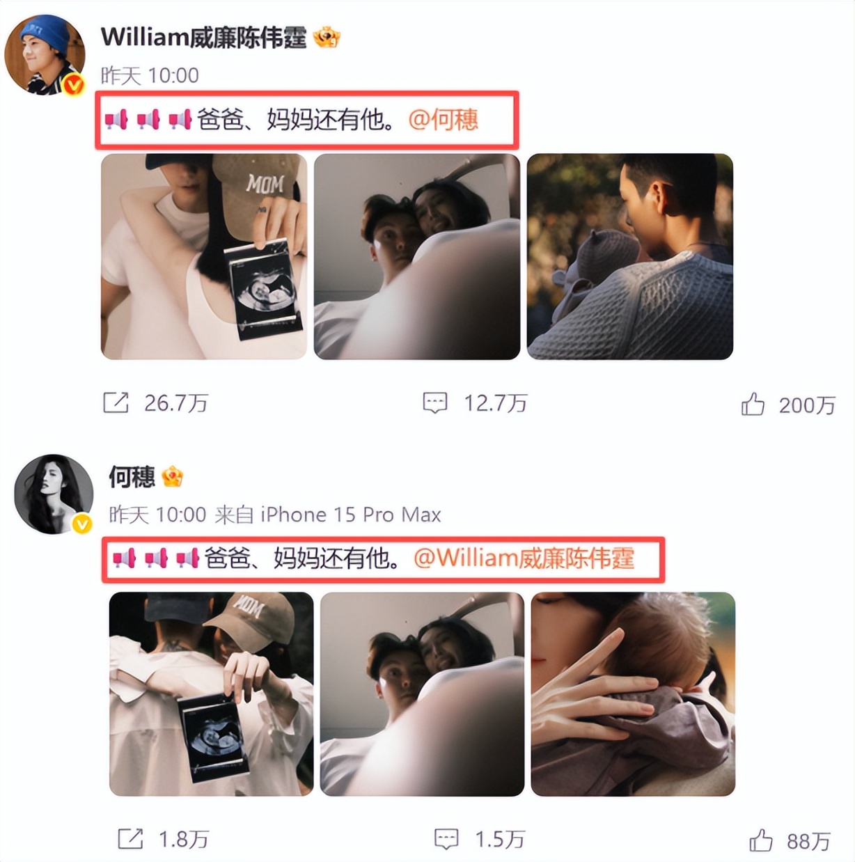 10月18日,陈伟霆跟何穗同时发了条微博,配图是俩人抱着个小婴儿,文字就几个字:"爸爸、妈妈还有他。"
