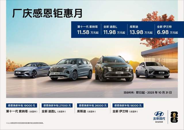 而且,这此政策并不止库斯途“价格给力”。北京现代把同一口径覆盖到四款核心旗舰:全新伊兰特把通勤的月度成本与基础智能一次安稳下来(厂庆感恩钜惠价6.98万起,不含国补;置换可叠最高18,000元感恩焕新补贴,含国补);想在15万价位一步到位,全新途胜L用“真省油、真省钱、真省心”的三省账本把溢价焦虑按下去(厂庆感恩钜惠价11.98万起,不含国补;置换可叠最高27,000元感恩焕新补贴,含国补);需要体面又好开,第十一代索纳塔把里子与面子同时交付(厂庆感恩钜惠价11.58万起,不含国补;置换可叠最高19,000元感恩焕新补贴,含国补)。同一规则、同一时间窗口,先认“厂庆感恩钜惠价”,再核资格叠加焕新补贴,省多少到店一算就明白。把决定交给可验证的价值,而不是传闻。活动只到10月31日,现在买北京现代,最值。