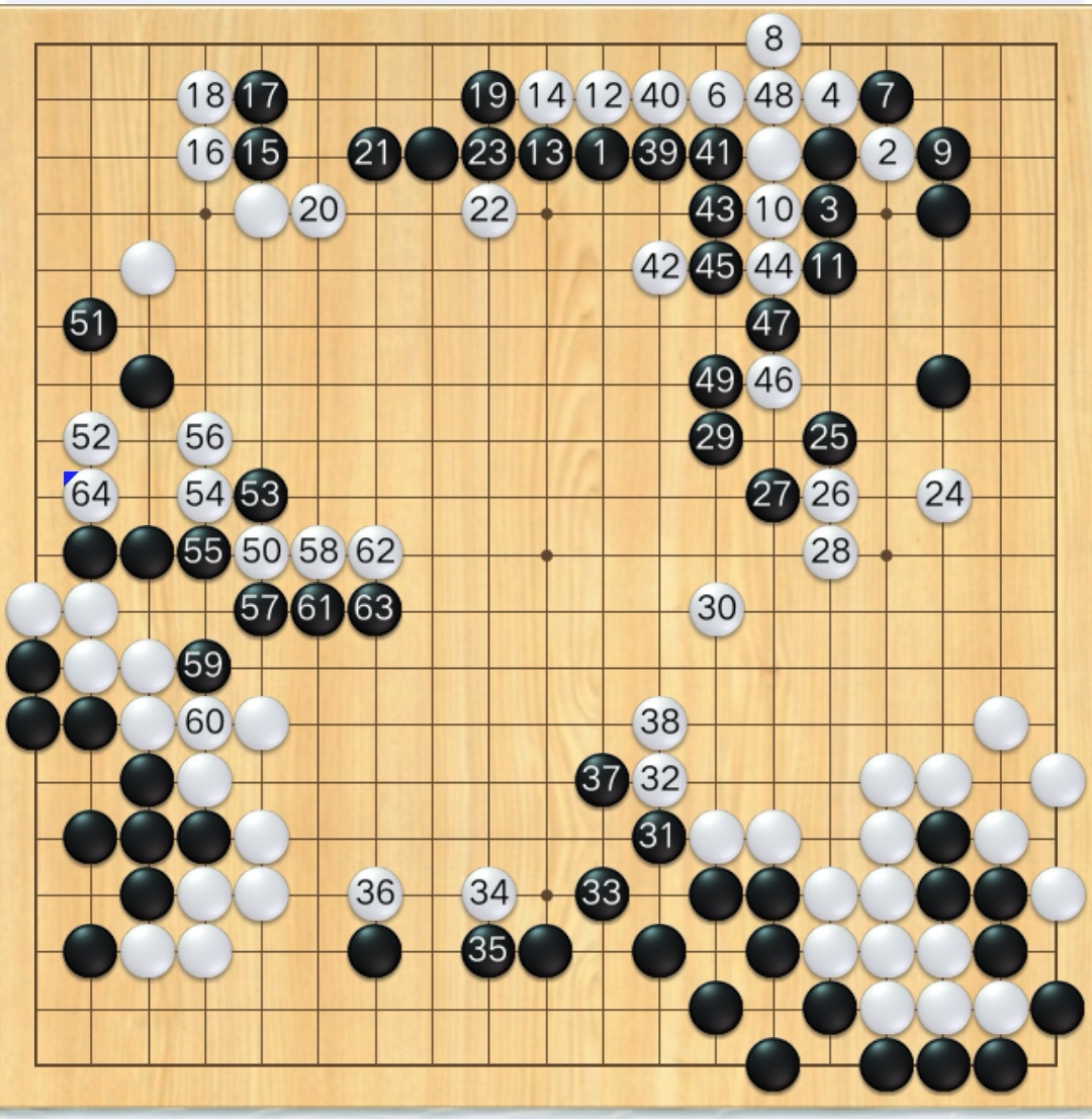 白14爬二路,竟然还没有净活,应该向中腹鼓。白46怎么走,上边的白棋都出来。只有破釜沉舟,攻击左边黑棋了。此时黑棋盘面领先大约10目,攻不死,能趁机围出10目棋也行。问题是左下白棋也没有净活,不能往左下追攻。 也不能让这黑棋与下边或上边的黑棋连上,难啊,除非黑棋自己杀死自己。