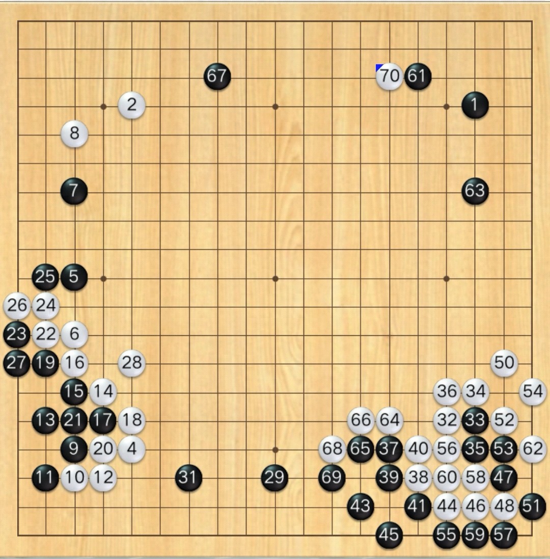 黑3在60位。白8连守带攻,很爽。白20先打,不怕黑棋渡过,否则白断点太多。黑37飞出,有点过分。(白30在39位的左边。)白40应该下在41位,变化请看参考图。(白42在41位的左边。)白42应该先在44位断。黑51如果在52位粘,则白在51位立,不可以扳。白56应该下在57位,黑棋不入气,无法渡过。白66可以不走这里的贴压。黑棋61、63、67在进行圈地运动。