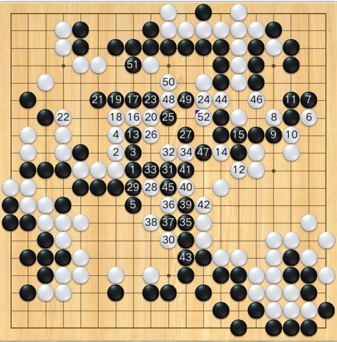 白6、12等,是看杀黑棋没有希望了。黑棋17、19、21、23、25、27胃口很大,还想趁机鲸吞点白棋,再多围点空。白棋36、38、40,个个如虎贲勇士,无不以一当十,搏命拼挡。白52下出后,没有想到,上边白棋以这样的方式,又活了,不需要杀黑棋了。黑棋想不出应对,超时负。