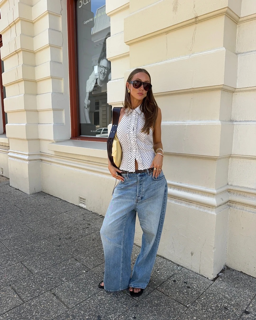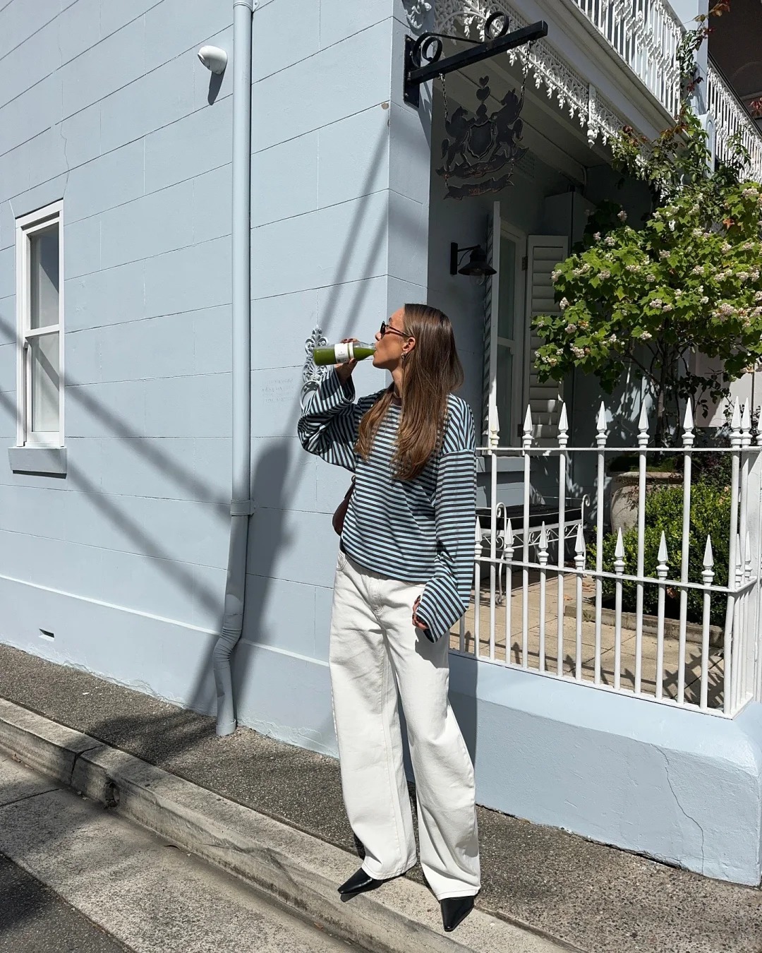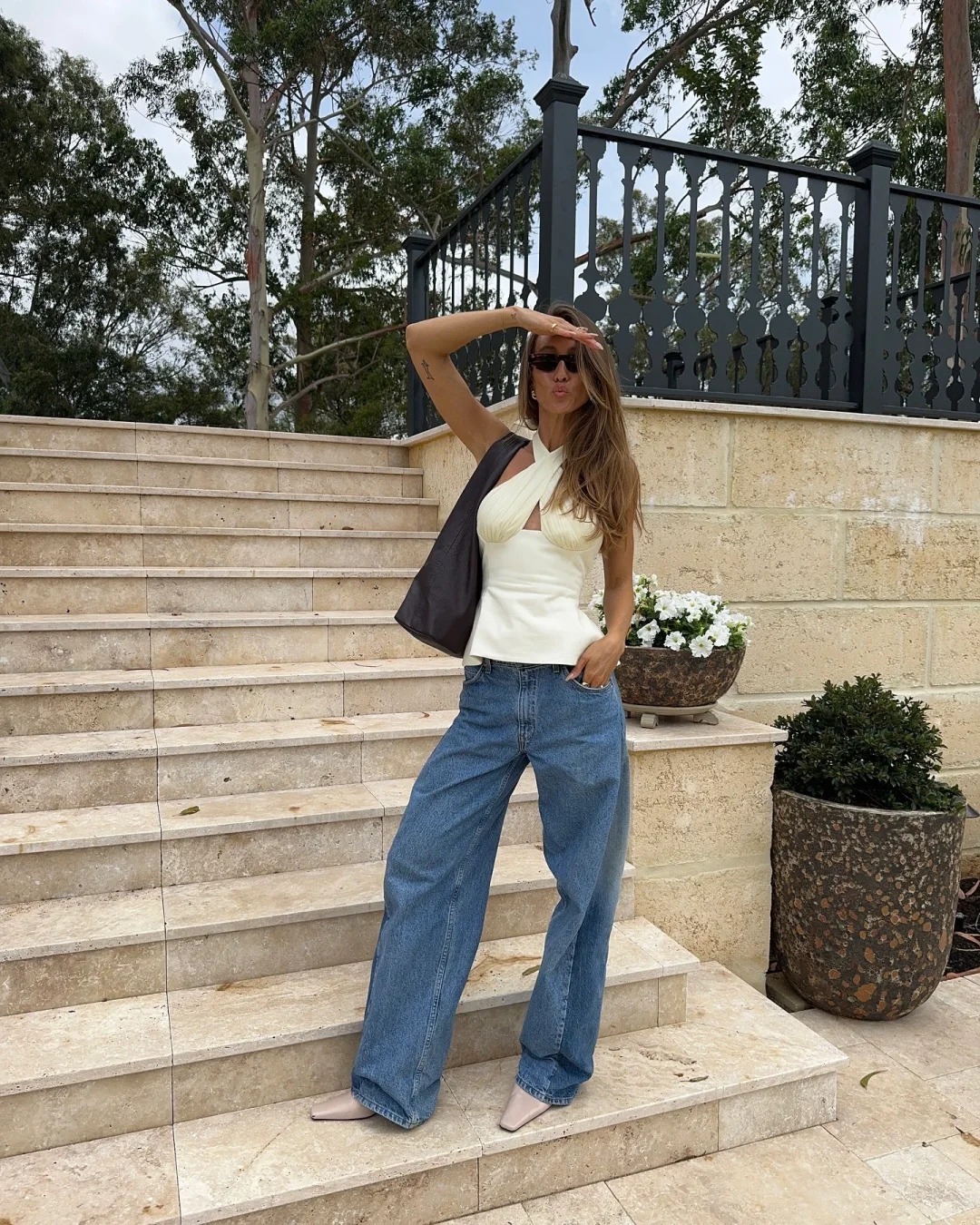 近期她分享了一套通勤 look,用一件垂坠感强的浅灰色西装,内搭贴身的白色吊带,下装选了一条高腰九分微喇牛仔裤,再配上一双裸色尖头低跟鞋,既保留了职场需要的利落感,又通过微喇裤的版型