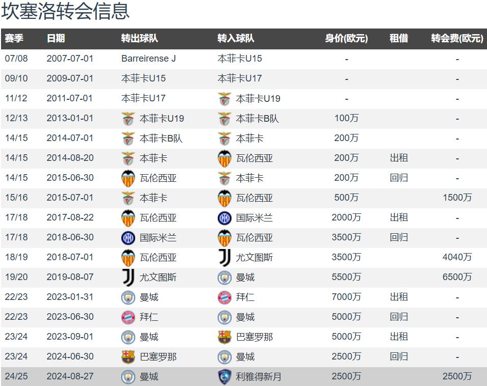 坎塞洛于2024年夏窗以2500万欧元的转会费从曼城加盟利雅得新月,但好景不长,随着意大利名帅小因扎吉到任,坎塞洛与主帅之间的矛盾遭弃用。坎塞洛2023-24赛季曾租借至巴萨效力,一个赛季42场4球5助,是巴萨的主力边后卫。