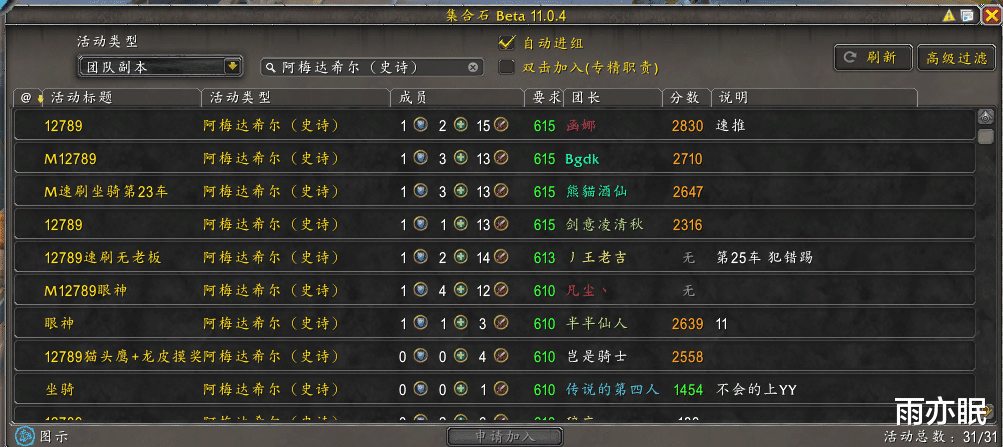 队伍的话直接从集合石上找,现在队伍还是比较多的,基本上600装等就轻松入组,选择团队副本-阿梅达希尔史诗模式。