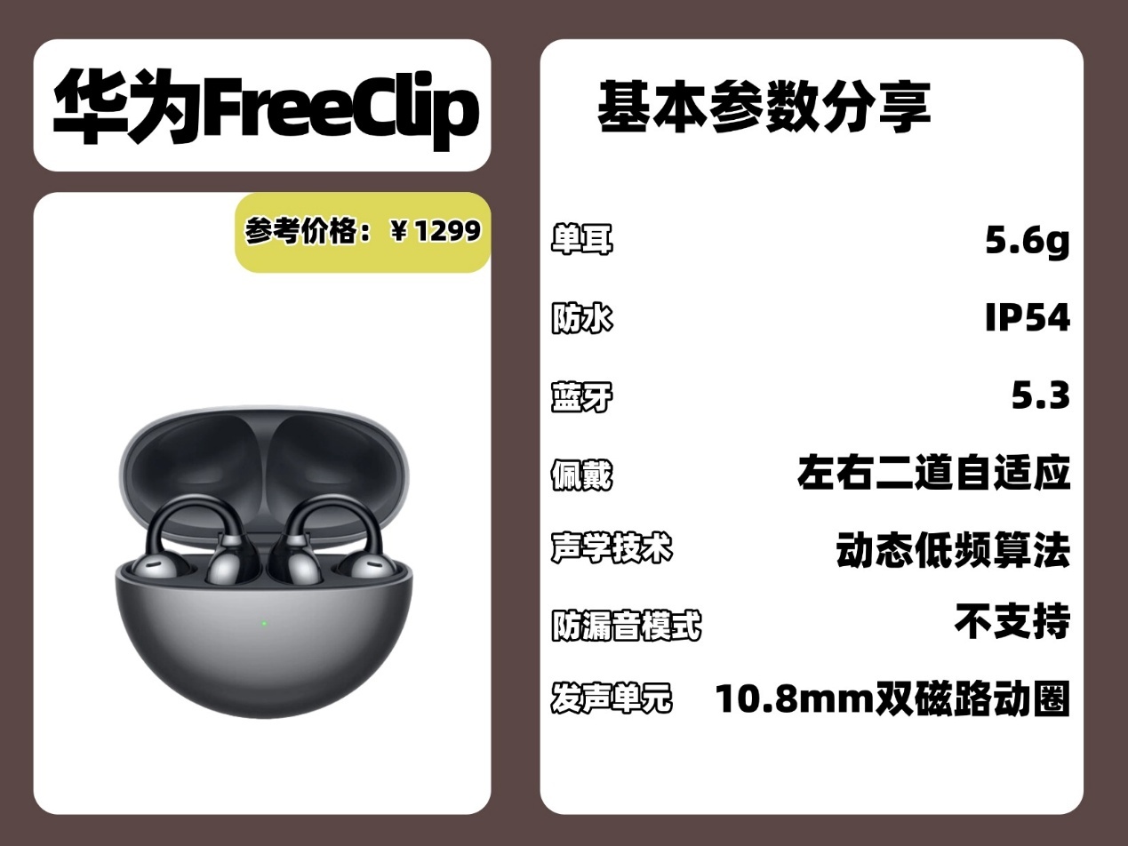 性能方面:性能方面,华为 FreeClip 使用的是蓝牙 5.3 芯片,连接稳定很不错,日常使用也不易出现断连的情况,体验很不错。它创新的耳夹式设计十分好用,不需要区分左右耳,不管是睡觉摸黑戴耳机,还是用完耳机放入充电盒时,都不用费心分辨方向,避免了手忙脚乱的尴尬。续航能力也完全够用,整机综合续航表现很不错,达到了36 个小时,不需要频繁充电。耳机还有着四个麦克风 ,即便在菜市场这样嘈杂的环境当中,它也能有效过滤掉噪音。