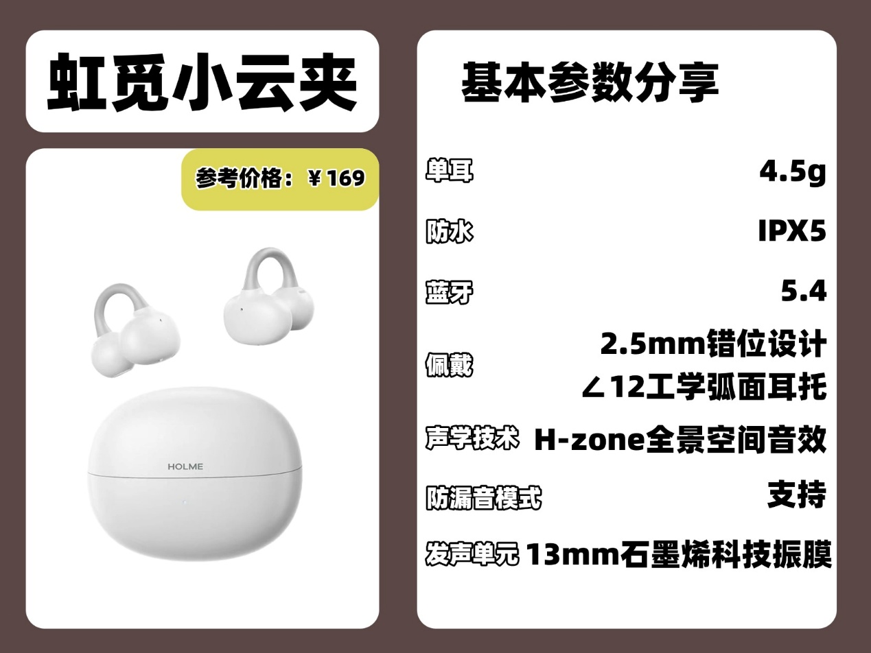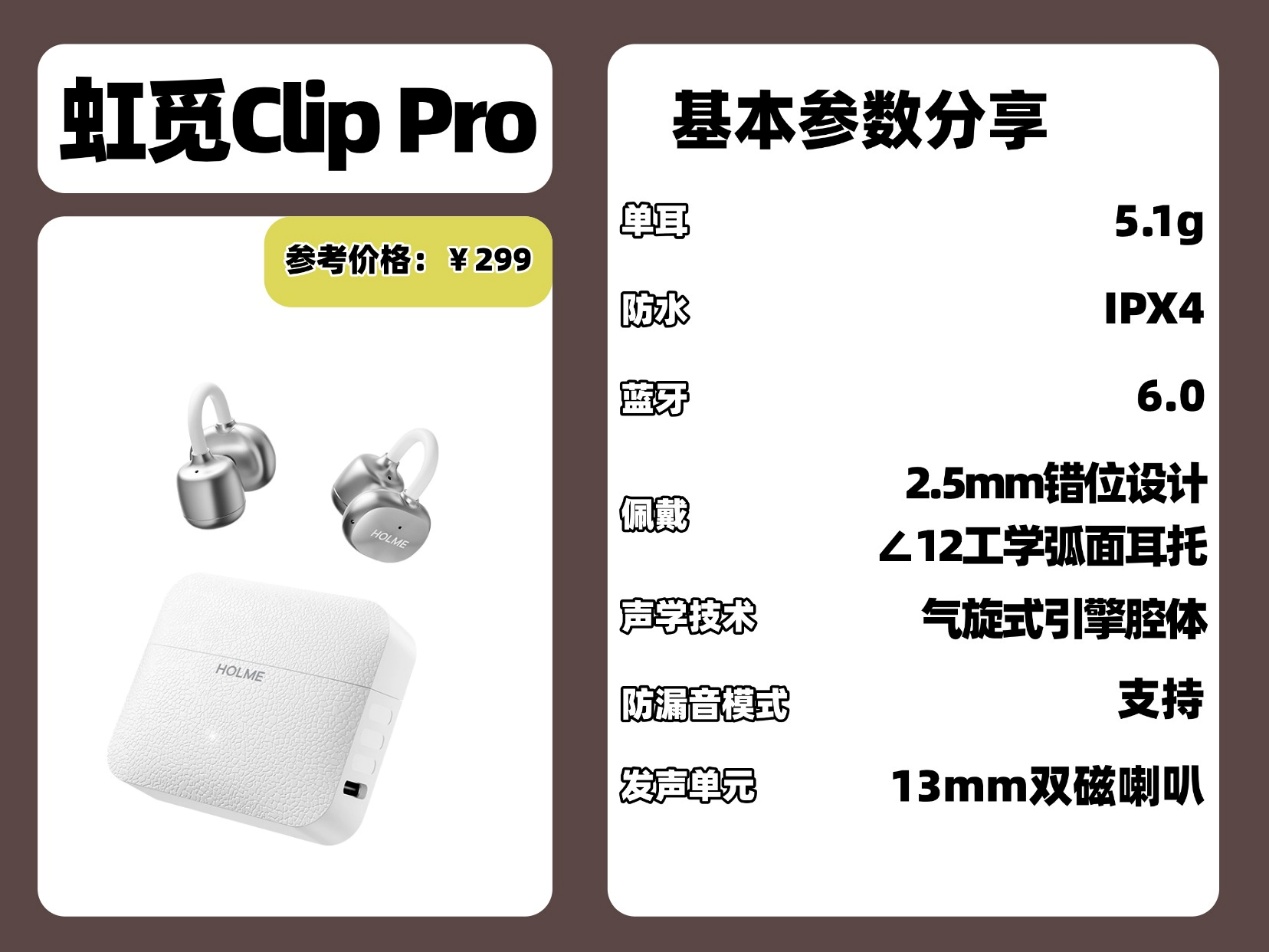 性能方面: 虹觅 Clip Pro 的性能表现同样毫不逊色!它搭载的是虹觅自研防漏音模式,开启后降漏音效果非常显著,可以有效解决开放式耳机的漏音问题,配置方面,虹觅使用的是最新版本的蓝牙 6.0 芯片,能大幅度提升蓝牙连接的连接稳定性,基本上不会出现,断连、延迟等问题,他还配备四麦克风设计,通话降噪效果十分出众,嘈杂环境中也能保持良好的通话效果!还支持智能一拖二功能,可同时连接两台设备, IPX5 级防水能力,运动出汗、小雨天气都能轻松应对;单次 8 小时,综合 40小时的续航,性价比直接给拉满了,在同价位段中由很强的竞争力。