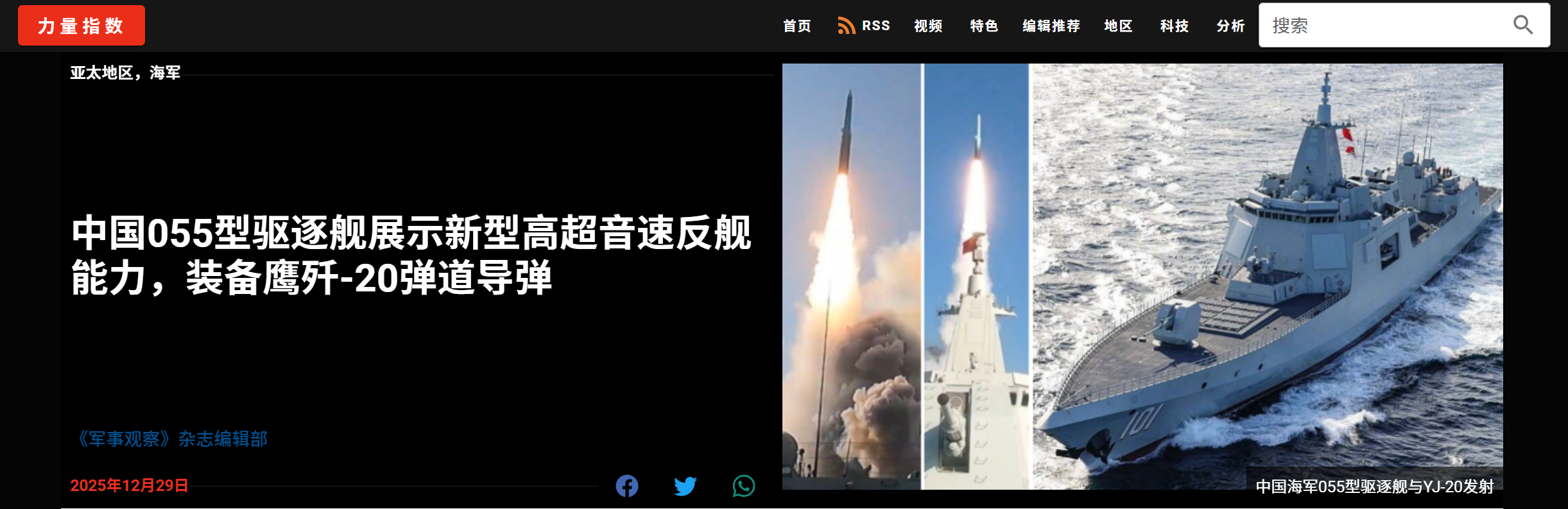 战区军事网站12月29日明确表示,055型万吨大驱和鹰击20,扩大其远程海上打击能力的射程和杀伤力,将A2/AD延伸到所谓的第一岛链之外,航母及其他高价值水面作战舰艇,必须与之保持更远距离的行动。