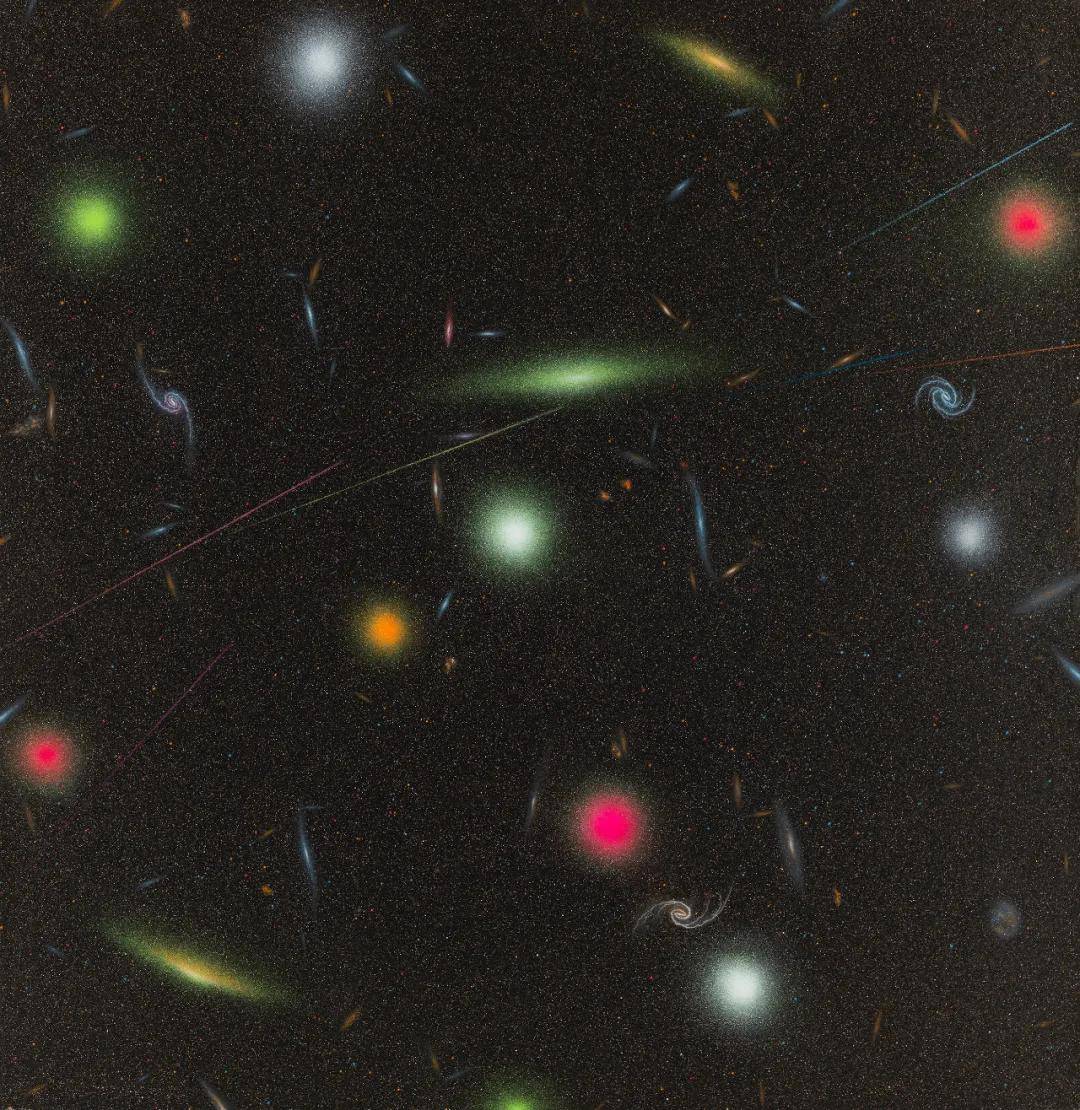 美国艺术史学家迈耶·夏皮罗在一次演讲中曾讲:“画家画什么和如何画,不自觉地取决于他的世界观”。这一观点强调了艺术家的哲学思考或世界观取向在艺术创作中的重要作用。显然,井中月的“星丛”系列作品是借助哈勃太空望远镜和韦伯空间望远镜延伸人类视域所建构的世界观。科学进步推动艺术发展,带来视觉观看经验的深刻变革。那些震撼的宇宙图像和深邃的超深空场是古典时代的艺术家不曾见到的宏观世界。井中月将宇宙中的天体、星云、星系与各种形态的物质、能量、意识等整合在“时空重叠”的图像空间中。通过表现既客观又主观,既理性又感性,既具象又抽象,既严谨又自由,既真切可感又充满想象的视觉图像,表达“非同一性”思维的当代意义。他以“时间无尽永前、空间无界永在、质量无限永有”的超验世界,传达对宇宙本质、世界本原和生命存在等永恒问题的终极思考。世界的表象是物质,意志为主导,本质是能量。实际上,这也是对叔本华“唯意志论”哲学主张“意志高于理性”,并且是宇宙的本质或本体的理念再现。