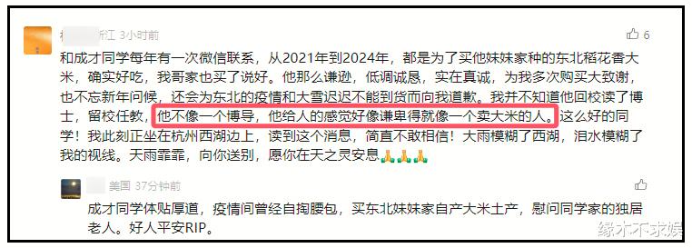 另一位网友称李成才是一个非常体贴厚道之人,为人谦逊、低调诚恳、实在真诚。该网友曾向李成才妹妹购买东北稻花香大米,因为大学延迟到货后,李成才非常谦卑的向网友道歉。该网友表示李成才根本不像一位博导,谦卑的像是位卖大米的。