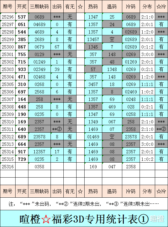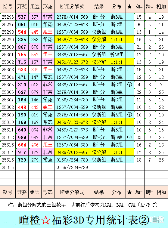 25316期:暄橙福彩3D综合条件(本期将在11月26日21:15开)一、上期回顾 ☆1、上期开奖号:7 2 9。2、和值= 18,跨度= 7。3、常态组六,012路组合。4、热度分布(热:温:冷)1:0:2。二、本期条件 ☆1、三期缺码:0358。2、热:169,温:047,冷:2358。3、断组分解式:0156//234-789。4、四胆:1469;三胆:469。三、术语解释 ☆1、三期缺码:0至9这十个自然数当中,未在近三期开奖号出现的数字。2、热度(热温冷):自然数0至9,在近七期开奖号中,出现3次及3次以上的数字,称为热码;出现2次的数字,称为温码;出现1次和未出现的数字,称为冷码。某个数字在开奖号中出现几个,就按几次计算。3、断组分解式:将0至9这十个自然数,分成三组数字,从前往后依次为A组(4码)、B组(3码)、C组(3码),一般情况下,有一组数字不出码,偶尔会有两组数字不出码。A组不出码的情况相对较少。断组为主,分解为辅。4、常态组六号码:同时包含大数、小数、奇数、偶数、质数、合数的组六号码,共有72注。统计表中,简称“常态”。5、非常态组六号码:全大数、全小数、全奇数、全偶数、全质数、全合数等六种形态的组六号码,共有48注。统计表中,简称“非常”。★提醒:彩市有风险,参与须谨慎!理性购彩,量力而行!多看少买,不要痴迷!任何条件都有出错的时候!水平有限,仅供参考!友好互动,好运相伴!