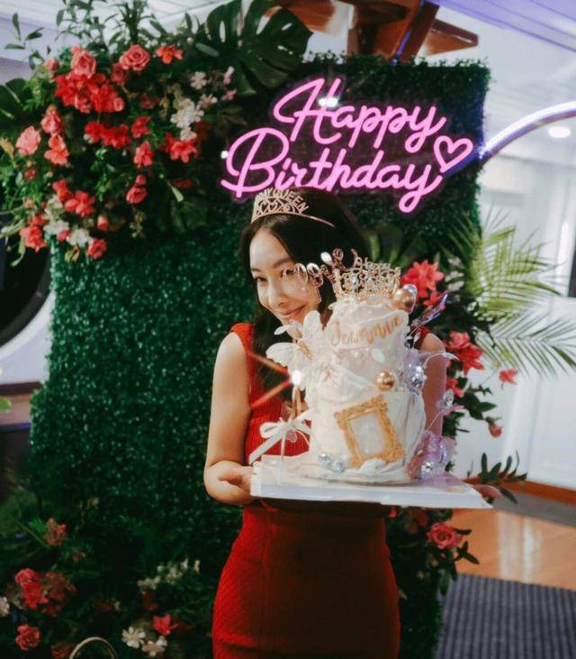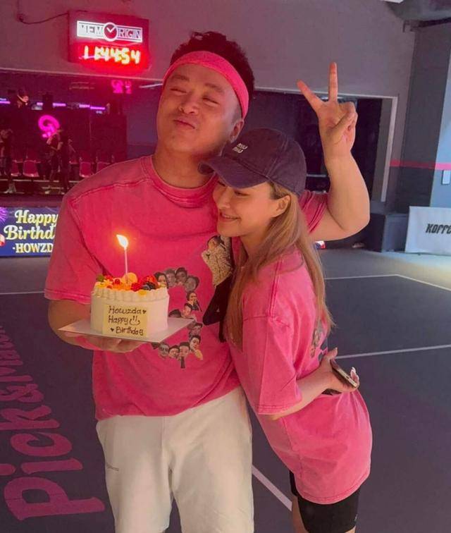 而另外她与一名男士的图片也是十分吸睛,图中两人分别穿起了粉红色同款的情侣装,男士右手手持生日蛋糕,左手比出V的字形。