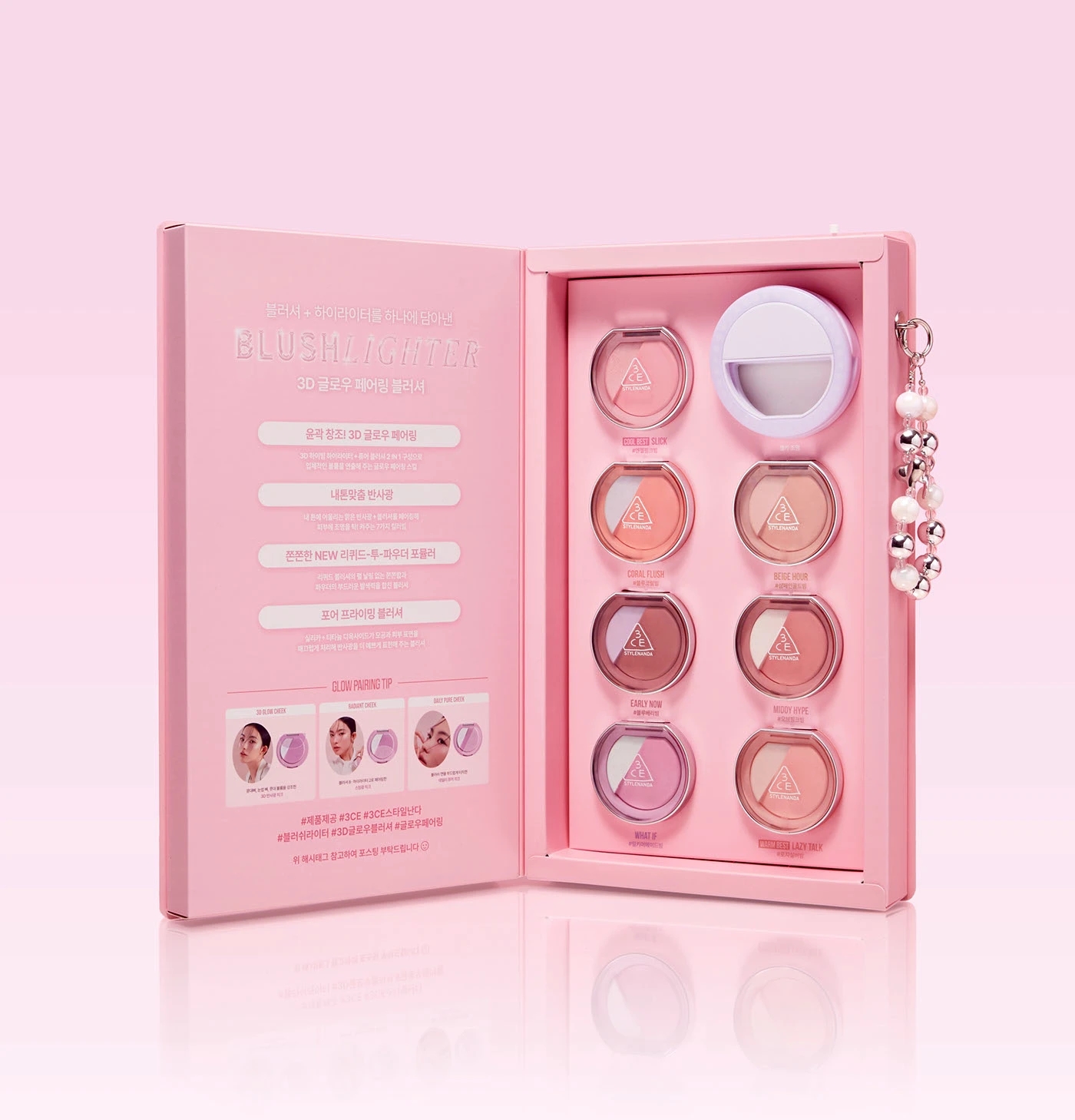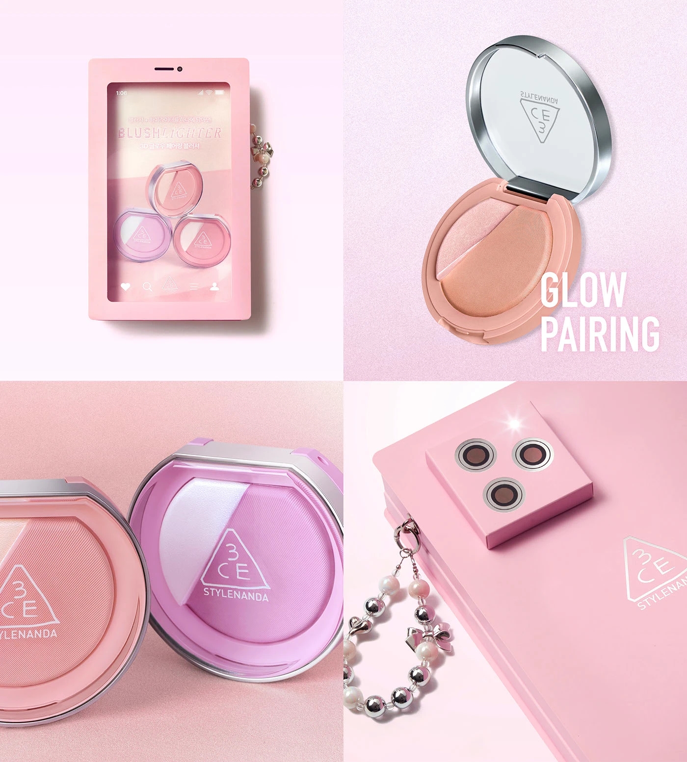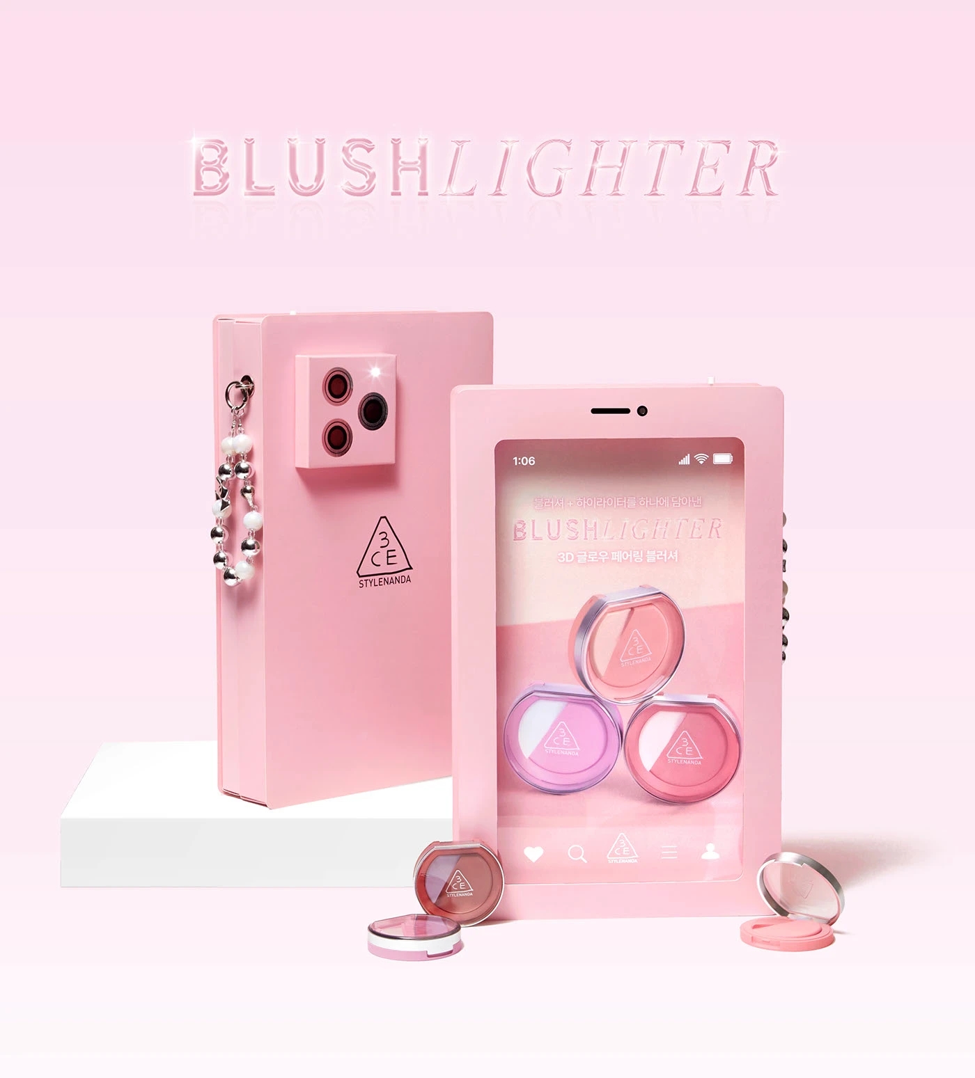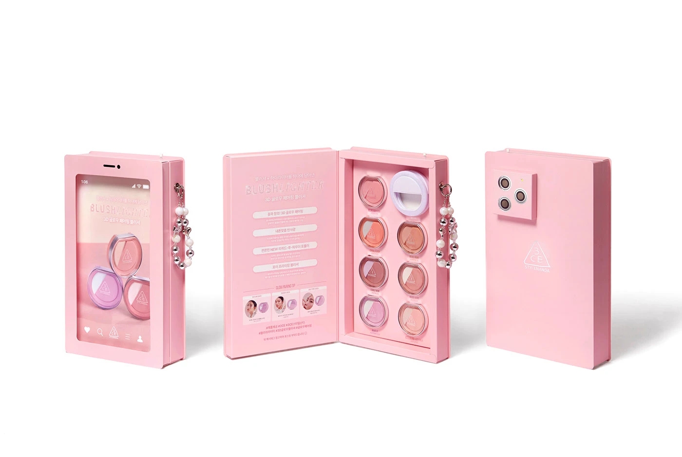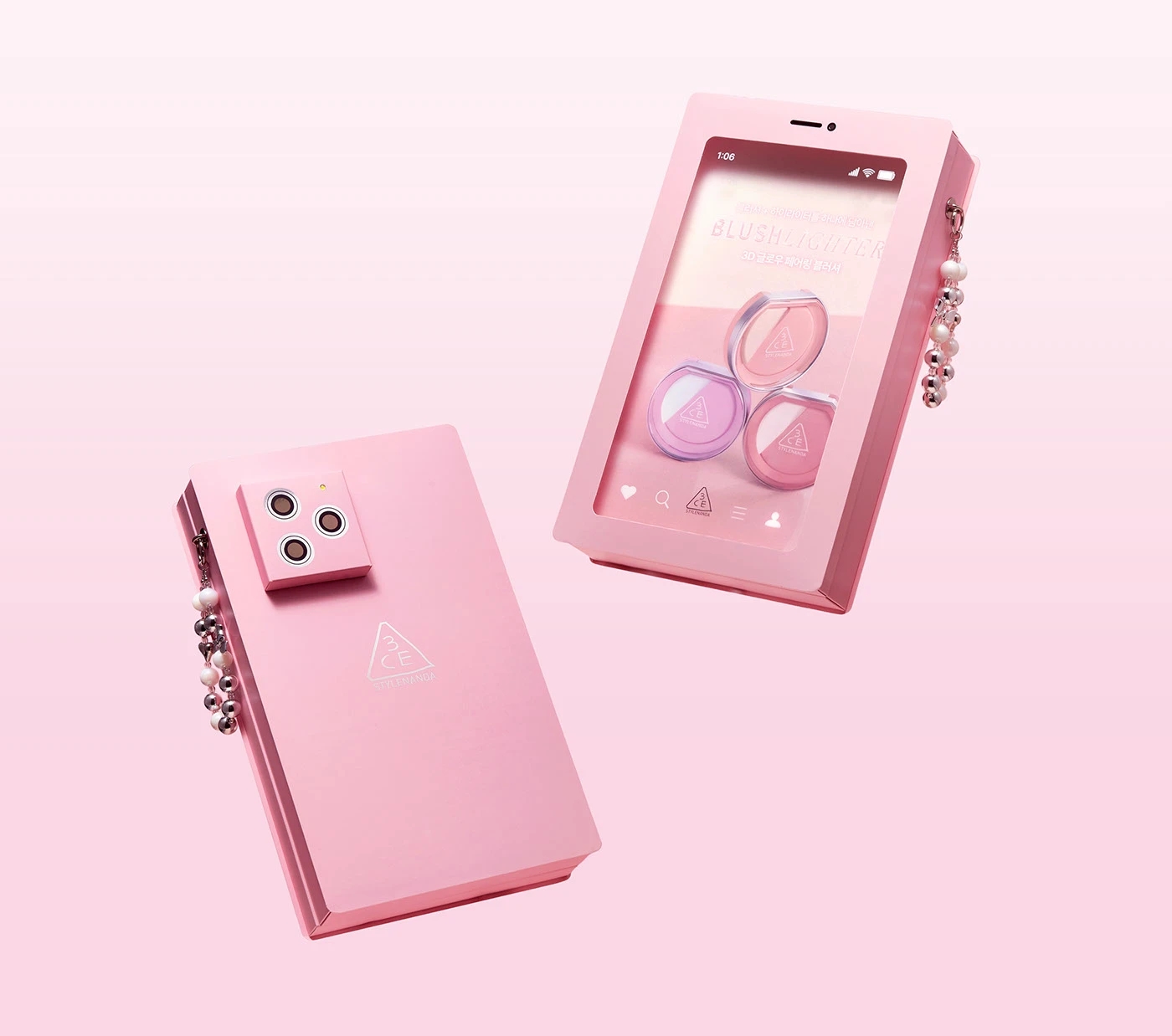 谁说化妆包只能平平无奇?3CE直接把腮红高光盘塞进“粉色手机”里!包装模拟智能手机造型,摄像头模块变装饰,珍珠链条一挂,瞬间化身少女心炸裂的时尚单品。打开“手机屏”,三色腮红高光盘像APP一样排列,自带补光灯(化妆镜)细节拉满,让人忍不住想拍照发圈!粉嫩配色+未来感结构,上脸颜值和包装颜值双在线,这波设计直接拿捏“视觉系”彩妆控!