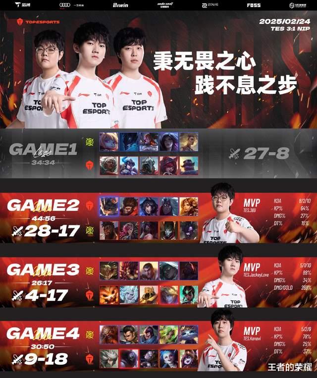 首局比赛中,NIP凭借Leave卡莎的极致操作与shanji波比的强势开团,以压倒性优势先下一城。TES前期布置遭NIP识破,JackeyLove连续阵亡,NIP通过精准资源控制与团战配合,仅34分钟便终结比赛。然而,TES迅速调整策略:第二局369的兰博以多次关键大招分割战场,Kanavi的猴子游走支援打破僵局,鏖战44分钟后艰难扳平比分;第三局JKL的EZ与Kanavi的佛耶戈联动控图,仅26分钟便碾压对手;决胜局中,Creme发条与Kanavi贾克斯的“大招Combo”更是直接击溃NIP防线。从首局的溃败到后三局的统治级表现,TES用行动诠释了“团队协作高于个人”的电竞哲学。