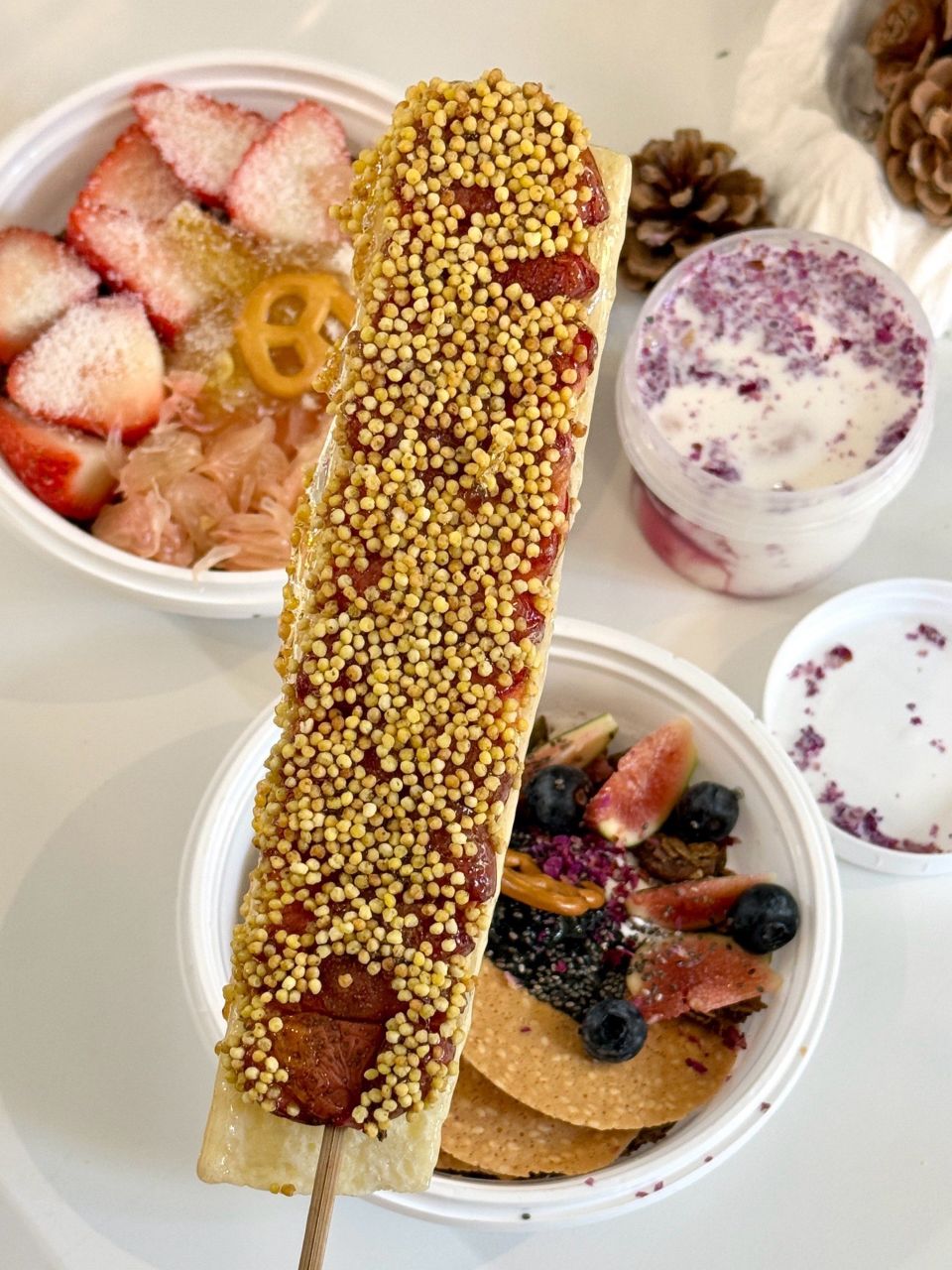 夹心工艺:在制作奶皮子糖葫芦的夹心时,同样有诸多讲究。奶皮子需切成 2 毫米左右的薄片,这样既能保证奶皮子的口感,又便于包裹水果。在包裹水果时,要预留 0.5 厘米左右的空隙,这是为了防止在糖衣冷却过程中,因体积收缩而对夹心造成挤压,导致奶皮子破裂或水果变形。对于一些创新款的奶皮子糖葫芦,如采用 “奶皮 + 酸奶 + 水果” 三明治结构的款式,制作工艺更为复杂。首先将奶皮子铺在底部,均匀涂抹一层冷萃酸奶,再放上精心挑选的水果,最后用另一层奶皮子覆盖。完成后,需将其放入冰箱冷藏 30 分钟进行定型,这样制作出的糖葫芦,夹心结构更加稳固,口感也更加丰富、绵密。
