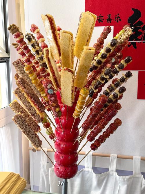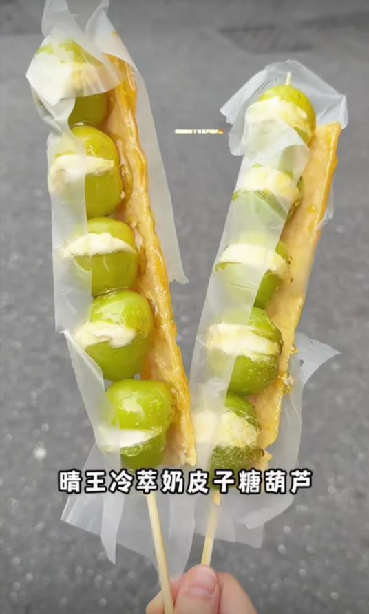 创意升级 —— 跨界食材:为了满足年轻一代消费者对新奇口感的追求,奶皮子糖葫芦在食材搭配上大胆创新,引入了多种跨界食材。晴王葡萄便是其中备受欢迎的一种,晴王葡萄颗粒硕大、甜度极高,轻轻咬开,清甜的汁水瞬间在口中迸发,与奶皮子的醇厚、糖衣的甜蜜相互交融,形成 “脆 - 绵 - 爆浆” 的奇妙口感。草莓的加入同样为糖葫芦增色不少,草莓鲜嫩多汁,带着清新的果香,与奶皮子搭配,口感更加丰富,层次分明。除了水果,糯米糍的软糯也为奶皮子糖葫芦带来别样风味,软糯的糯米与奶皮、水果层层叠加,每一口都充满惊喜;冷萃酸奶的清爽则为整款糖葫芦注入了一股清新活力,酸奶的微酸与奶皮的奶香、水果的甜香完美结合,解腻又开胃。这些创新食材与奶皮的组合,充分满足了 Z 世代对 “复合口感” 的追求,让奶皮子糖葫芦成为年轻人爱不释手的时尚美食。