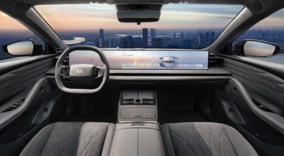 外观上,银河E8延续了吉利“光之涟漪”设计语言,封闭式格栅与分体式灯组勾勒出极简前脸。最吸睛的是车头158个窗口组成的发光矩阵,0.105平方米的发光面积可呈现迎宾、欢送、音乐秀等动态效果——当你深夜归家,它用流动的光效迎接,仪式感不逊豪华车。而0.199Cd的超低风阻(比保时捷Taycan的0.22Cd更优),不仅降低了高速行驶的能耗,更让车辆在120km/h时仍保持稳健,风噪控制远超同级。