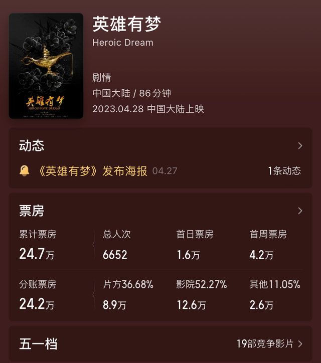 这些沦为炮灰的新片中,就有一部名叫《英雄有梦》的电影,算是今年五一档最惨的新片之一了。