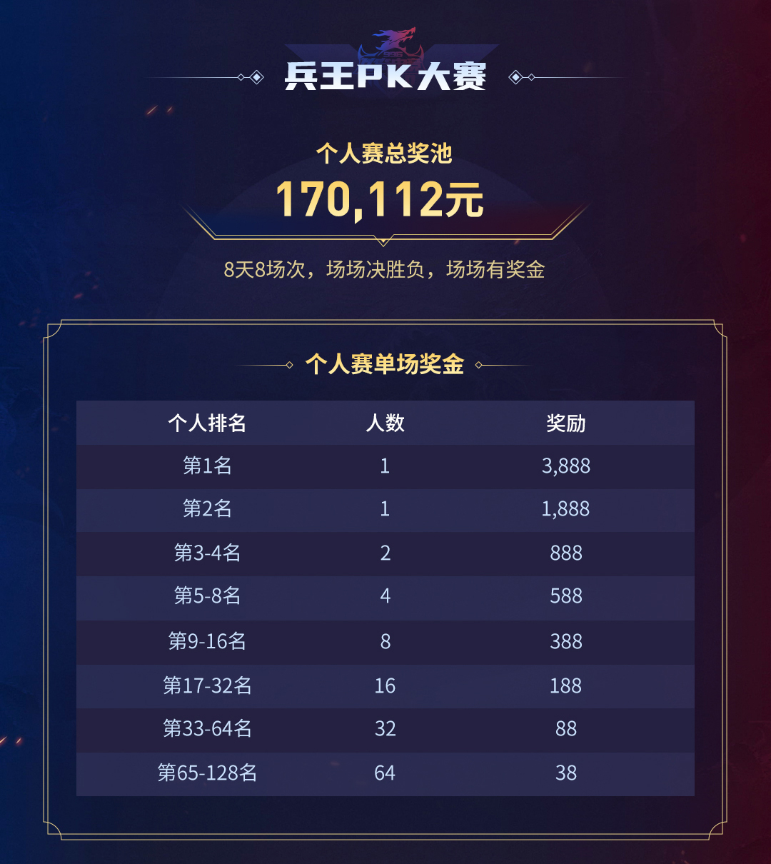 兵王PK大赛将于2025年11月25日开赛,截止到2025年12月12日,共计八场。场场决胜负,场场有奖金!兵王PK大赛总奖励为170,112元,每位参与玩家根据排名将获得不同的奖励,共设置128名排名奖。可在比赛期间于每天18:00,前往996传奇盒子赛事中心启动“兵王PK大赛”进行报名签到。