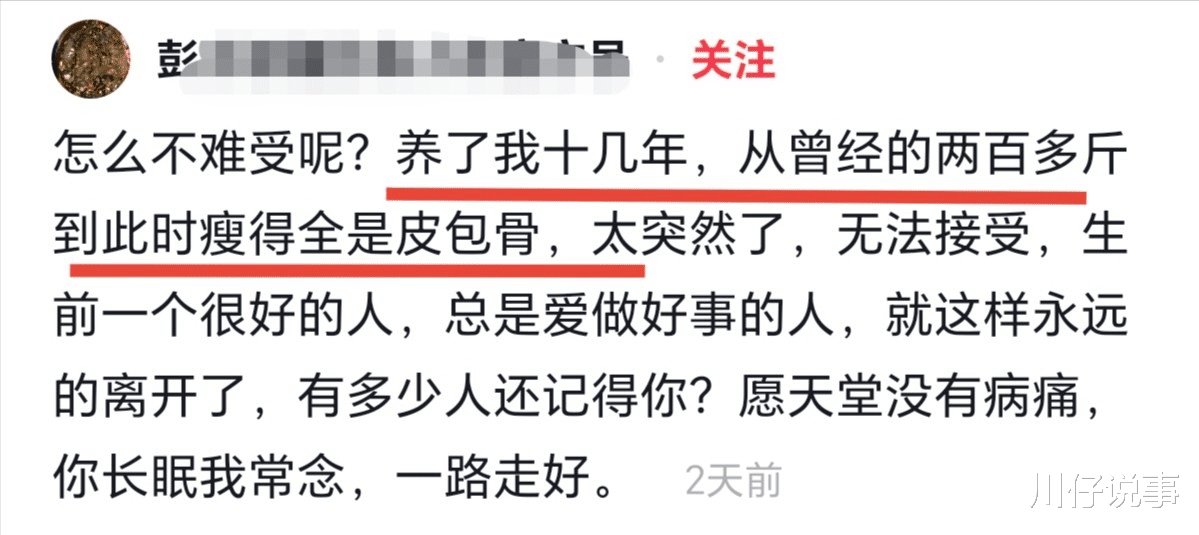 1月7日,一位博主在社交平台发布悼念:“养了我十几年的爸爸,从曾经的两百多斤瘦成如今的皮包骨,太突然了,无法接受。生前一个很好的人,总是爱做好事的人,就这样永远离开了,有多少人还记得你?愿天堂没有病痛,你长眠我常念,一路走好。”