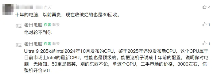 Ultra 9 285k是Intel 2024年10月发布的CPU,鉴于2025年还没发布新CPU,这个CPU属于目前市场上Intel的最新CPU,性能也是顶级的。能把这个配置说成十年前,证明对电脑完全不懂。