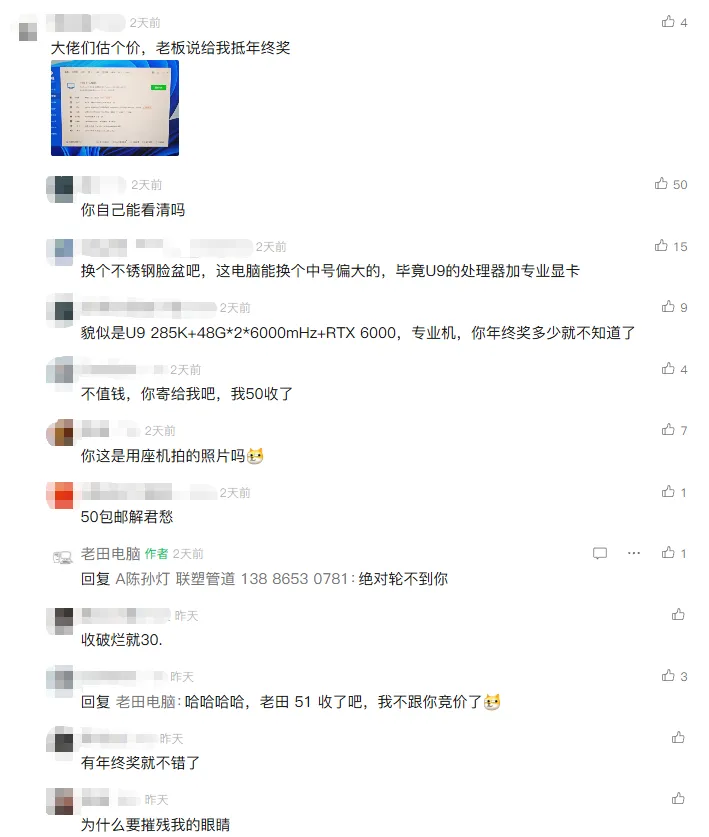 在文章后面,有位老铁发了一条评论,内容是说,他也遇上了类似的状况,老板今年准备给他的年终奖,也是一台电脑。想让大家看看,这台电脑值多少钱。