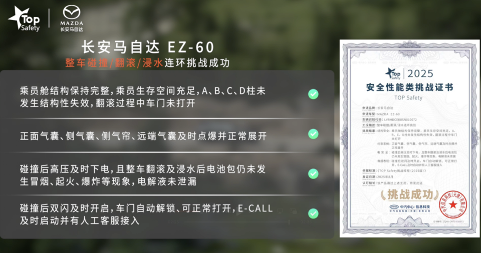 今年9月13日,长安马自达发布的全新车型MAZDA EZ-60在汽车行业内再度鸣响,荣获了“2025中国十佳车身”与“最佳材料奖”两项大奖。由中汽中心和汽车行业专家共同评定,这两个奖项代表着中国汽车车身技术领域的最高水平。MAZDA EZ-60的出色表现不仅展示了其在制造工艺和材料创新方面的卓越实力,更为即将在9月26日的正式上市奠定了坚硬的基础。