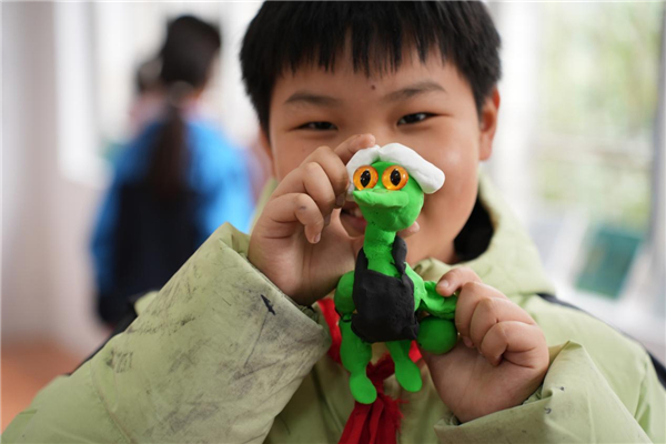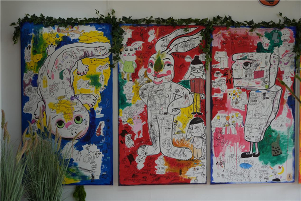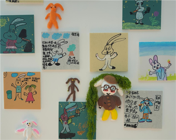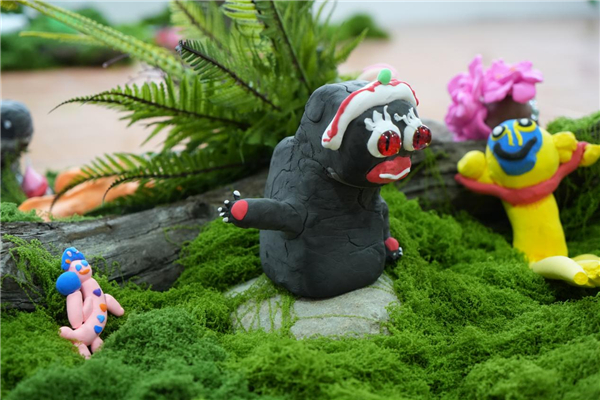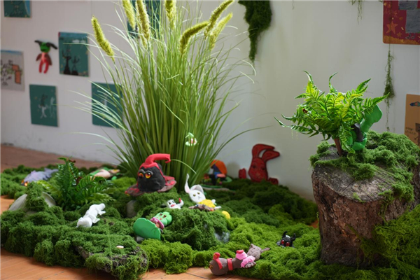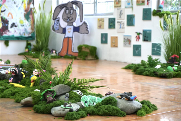 “太平完小离梵净山那么近,孩子们喝着梵净山的水、吃着梵净山的粮长大,却有很多人没真正走进过这座家乡的圣山。” 正是这份对家乡的深情,让他萌生了带孩子们“把心中的梵净山创造出来”的想法。扎根乡土,方能绽放美育之花。此次共创项目以江口县标志性的梵净山为创作原点,深挖在地文化资源,将金丝猴、娃娃鱼、鸽子花、蘑菇石及兔想想等独属于梵净山的自然生灵与地质奇观,转化为孩子们触手可及的艺术素材。在四天的共创时光里,许峰摒弃“单向授课”的传统模式,以“人人都是艺术家”为核心理念,引导孩子们自主观察、大胆想象。孩子们拿起画笔勾勒心中的梵净精灵,揉捏彩泥塑造灵动的山野生灵,从画作到雕塑,每一件作品都饱含着大山孩子对家乡的质朴热爱与天马行空的创造力。创作之后,许峰还与孩子们一同动手布置教室,将一件件充满童趣的作品陈列其中,原本普通的教室摇身一变成为充满奇幻色彩的“梵净精灵童话乐园”,甚至乐园的匾额,也是太平完小的学生自己书写及装点,许峰期望在大山深处,与孩子们一起创造一座乡村迪士尼乐园,让艺术实践真正走进孩子们的日常。