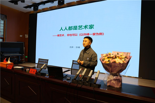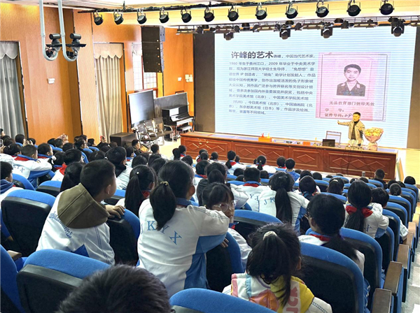 为进一步赋能乡村美育教师,夯实乡村美育根基,许峰在江口县第一小学为当地美术教师带来了一场别开生面的专题讲座。讲座中,他以自身家庭三代人的艺术实践为切入点——从身为裁缝的母亲手中的针线艺术,到自己的当代艺术创作,再到孩子充满童真的艺术表达,生动诠释了“艺术源于生活,人人皆可艺术”的理念。他强调,乡村美育不应脱离本土文化土壤,要善于挖掘地域性、传统文化中的艺术养分,让孩子们在熟悉的乡土文化中找到艺术创作的自信与灵感。这场兼具温度与深度的讲座,为当地美术教师打开了全新的教学思路,推动美育教学在创新与传承中稳步前行。