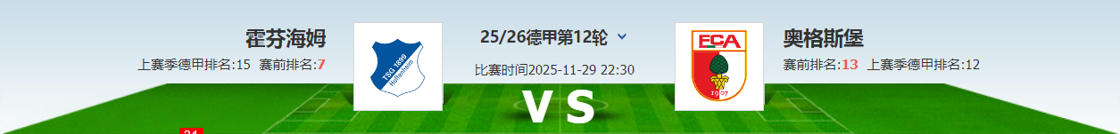 德甲第12轮的比赛即将打响,本场由主场的霍芬海姆迎战奥格斯堡。霍芬海姆目前取得了6胜2平3负的成绩,积20分排在积分榜第7位;奥格斯堡目前取得了3胜1平7负的成绩,积10分排在积分榜第13位。