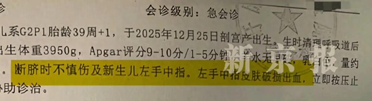 盛某某坐医院的车带着刚出生的儿子到南京儿童医院就诊。被婉拒后又送到江苏省第九人民医院。医生诊断,新生儿受伤的这根手指里面的筋和肌腱以及骨头都受伤了。